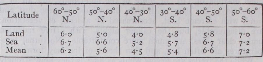 The distribution of cloudiness resembles that of humidity, rang ing from one-tenth in the interior deserts to nine-tenths in the oceanic storm areas. The averages for different latitudes are as follows : Seasons in the temperate zones are classified according to tem perature, not, as in the Tropics, by rainfall. The four seasons are important characteristics, especially of the middle latitudes of the north temperate zone. Towards the equatorial margins of the zones the difference in temperature between summer and winter becomes smaller, and the transition seasons weaken and even disappear. At the polar margins the change from winter to sum mer, and vice versa, is so sudden that there also the transition seasons disappear. These seasonal changes are of the greatest importance in the life of man. The monotonous heat of the Tropics and the continued cold of the polar zones are both de pressing. The seasonal changes of the temperate zones stimulate man to activity and encourage higher civilization.