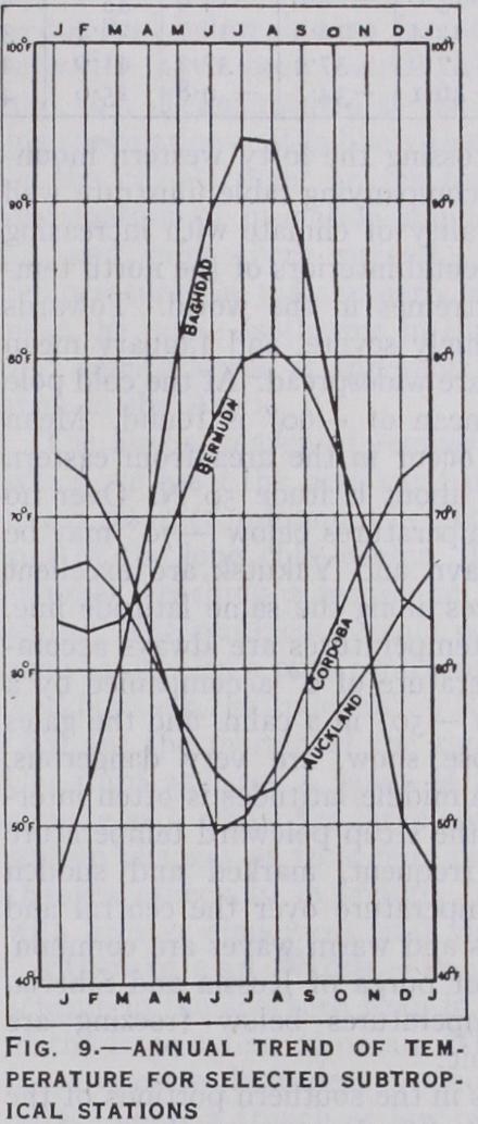 From the position of the sub-tropical belts to leeward of the oceans, and at the equatorial margins of the temperate zones, it follows that their temperatures are not extreme. Further, the protection afforded by mountain ranges, as by the Alps in Europe and the Sierra Nevada in the United States, is an important factor in keeping out extremes of winter cold. The annual march and ranges of temperature depend upon position with reference to continental or marine influences (fig. 9). The Mediterranean basin is particularly favoured in winter, not only in the protection against cold afforded by the mountains, but also in the high perature of the sea itself. The southern Alpine valleys and the Riviera are well situated, having good protection and a southern exposure. The coldest month ally has a mean temperature well above 3 2 ° . Mean minimum peratures of about, and what below, freezing occur in the northern portion of the trict, and in the more nental localities such as northern Spain and the Balkans minima a good deal lower have been served. Somewhat similar ditions obtain in the sub-tropical district of North America. Under the control of passing cyclonic storm areas, hot or cold winds, which often owe some of their special characteristics to the topography, bring into the tropical belts, from higher or lower latitudes, unseasonably high or low temperatures. These winds have been given special names (mistral, sirocco, bora, etc.) . Cloudiness is moderate in winter but very small in summer. The winter rains do not bring ously overcast skies, and a mer month with a mean cloudiness of one tenth is not exceptional in the drier parts of the sub-tropics.
