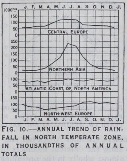 The winter maximum of rainfall and cloud on the west coasts becomes a summer maximum in the interiors. The change is grad ual in Europe, as is the change in temperature, but more sud den in North America. The rainfall curves for central Europe and for northern Asia illustrate these continental summer rains (see fig.io). The summer maximum becomes more marked with increasing continental character of the climate. There is also a well-marked decrease in the amount of rainfall inland. In western Europe rainfall averages loin. to 3oin., with much larger amounts (reaching i 2oin. and even more) on bold west coasts, as in the British Isles and Scandinavia, where moist Atlantic winds are deflected upwards, and also locally on_ mountain ranges, as on the Alps. There are small rainfalls (below 2oin.) in eastern Scandi navia and on the Iberian peninsula. Eastern Europe has generally less than 2oin., western Siberia about i sin., and eastern Siberia about loin. In the southern part of the great overgrown continent of Asia an extended region of steppes and deserts, too far from the sea to receive sufficient precipitation, shut in, furthermore, by mountains, controlled in summer by drying northerly winds, receives less than loin. a year, and in places less than Sin.