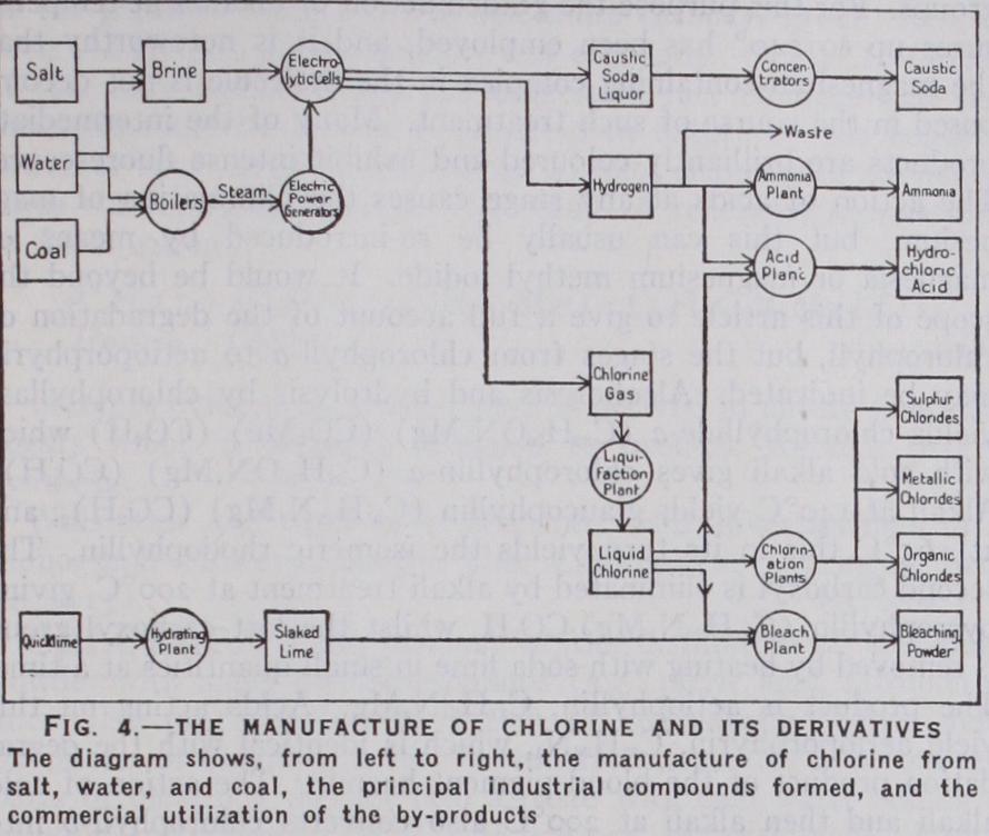 Even from the above abbreviated description of the industry, it will readily be seen that chlorine, like so many other raw materials of the modern world, is one of those products which, without being obtrusive, and, in fact, without being known even by name to the vast majority of people, yet has a profound influence on our daily life. Newspapers, clothes, medicines, colours, sanita tion and petrol, for example, are matters of concern to everyone, and all consume chlorine or its derivatives at some stage. In when first discovered by Scheele, it was a chemical curi osity masquerading under the name of "dephlogisticated marine acid air" ; it is now a necessity.