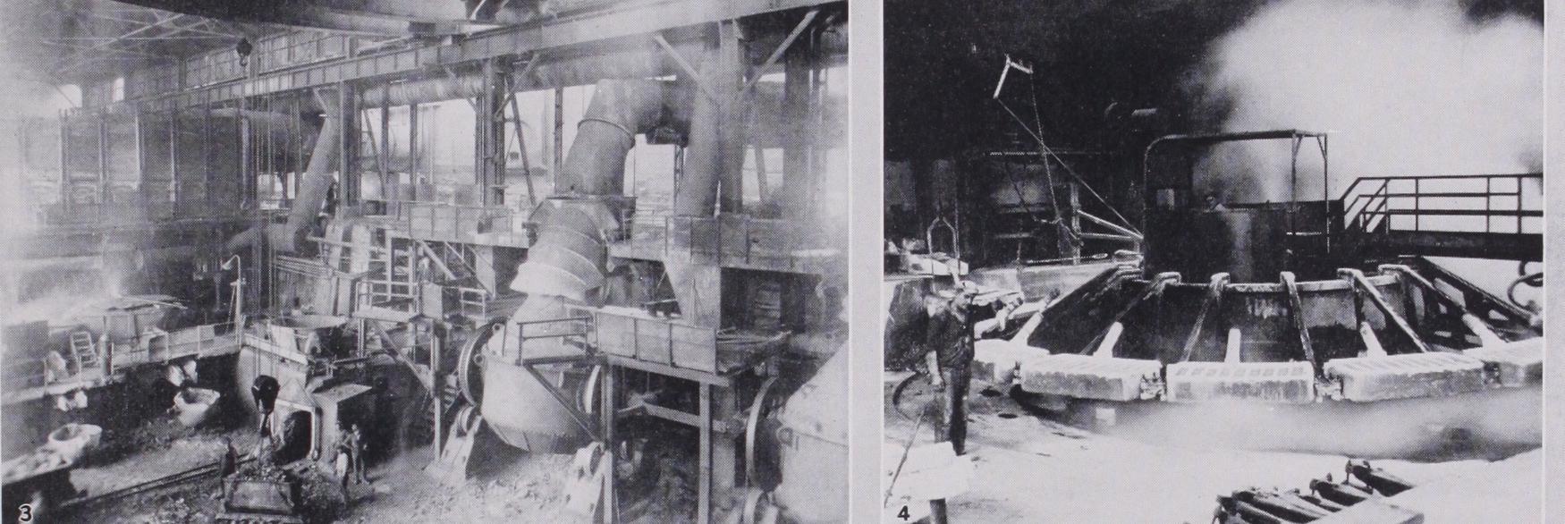 The McDougall type furnace is essentially a verti cal cylinder with superimposed horizontal hearths and a central rotating shaft with radial arms for stirring the ore. The ore is fed in mechanically at the top of the furnace and is displaced by the rabble arms towards the periphery when it drops to the hearth beneath. The rabbles are here arranged to move the ore in the opposite direction, succeeding hearths being arranged alternately with slots provided for the ore to drop from one hearth to the next beneath. The central shaft and arms, water cooled in the original design, are now pressure air cooled as this offers several advantages, amongst which may be cited the absence of scaling and the possi bility of returning the heated air to the bottom of the furnace for combustion purposes. Various other types of mechanical roasting furnaces were at one time used for copper ores but they have all been superseded by one of the several modifications of the Mc Dougall furnace, variously known as Evans-Klepetko, Herreshoff or Wedge furnace. The modern practice is to treat this calcine or roasted material in reverberatory furnaces, which have been con tinuously increasing in size, although they now appear to have reached their maximum as regards length. The tendency in most recent construction is to make them approximately molt. in length and to increase the width, although constructional diffi culties have hampered this development and few exceed 25ft. in width. All these modern furnaces use either pulverized coal or oil as a fuel, the choice depending on economic factors, great economy being effected by passing the flue gases through waste heat boilers to recover rather more than a third of the heating value of the fuel in the form of steam. The charging of the hot calcines is carried out along the sides of the furnace at frequent intervals, and this practice combined with the addition of highly siliceous ore for fettling purposes preserves the furnace sides. The furnace has two distinct functions, the first being the smelting of the charge, and the second the settling of the matte produced. The matte usually contains approximately 40% copper and is with drawn intermittently as required for further treatment. The slag is withdrawn continuously from the far end of the furnace and flows into slag cars or granulating troughs. Such slags contain rather more copper than blast-furnace slag, and this is probably accounted for by dusting during the charging of such fine ma terial. Special precautions are taken to collect the flue dust which is returned for further treatment. The next operation consists in the elimination of the sulphur from the matte and the produc tion of blister copper in one operation.