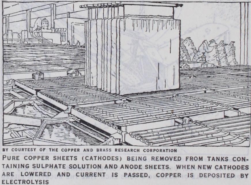 Copper made by this process con tains a negligible quantity of impurities, and constitutes by far the greater portion of the world's production. The earliest attempt to refine copper electrolytically was made by Elkington, whose first patent is dated 1865. He cast crude copper into plates which were used as anodes, sheets of electro-deposited copper being used as cathodes. Six anodes were suspended alternately with four ca thodes in a saturated solution of copper sulphate in a fireclay trough all the anodes being connected in one parallel group and all the cathodes in another. A hundred or more troughs were coupled in series, the cathodes of the one to the anodes of the next, and they were so arranged that, with the aid of side pipes with leaden connections and India rubber joints, the electrolyte could be made to circulate once daily through them all from the top of one jar to the bottom of the next. The passage of current was con tinued until the anodes were of no further use and the cathodes, when thick enough, were removed and either cast into cakes and rolled or disposed of as cathodes. Silver, gold and other insoluble impurities collected at the bottom of the tanks up to the level of the lower side tubes and were then run off as mud through plugs or holes in the bottom, and collected in settling tanks for further treatment. Elkington's method is now known as the multiple sys tem; a second method of connecting up the tanks, known as the series system, being introduced in 1886. America produces the greater part of the electrolytic copper required and over 8o% of this copper output is prepared in this manner. The efficiency of the process is dependent on the composition, character and tem perature of the electrolyte, the current density and the voltage, all of which have to be carefully controlled.