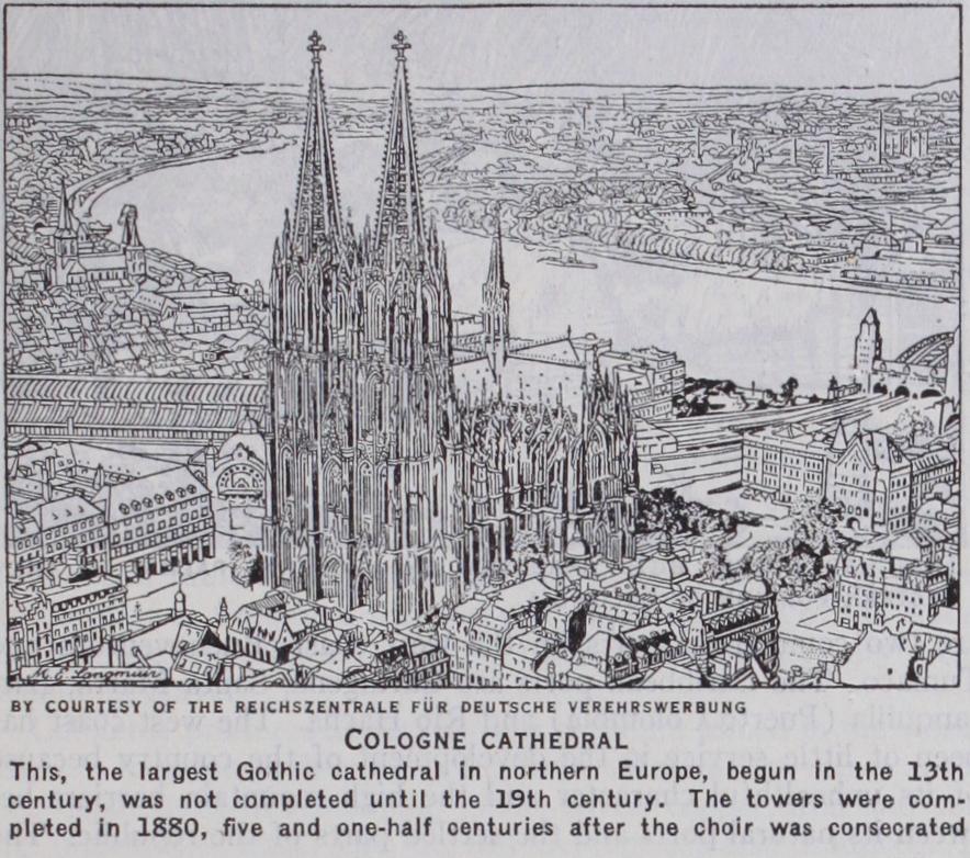 The Gurzenich was a former meeting-place of the diets of the Holy Roman empire and built between 1441 and 1447. The ground floor was in 1875 converted into a stock exchange, and the upper hall utilized for public festivities. The Rathaus (I 3th century) has beautiful Gobelin tapestries. The Tempelhaus, the seat of the patrician family of Overstolzens, is a building of the 13th century, now the chamber of commerce. There is also the Wallraf-Richartz museum, with a collection of paintings by Italian and Dutch masters ; the Zeughaus, built on Roman foundations ; and the municipal library and archives. The Wolkenburg, a Gothic house of the 15th century, was restored in 1874. Near the cathedral is a museum of church antiquities. Cologne has numer ous educational institutions including a new high school for music, on university lines, subsidised by the municipality, the province and the Prussian state. The number of students is limited to 500. The municipal theatre (Stadttheater) is famed for its operatic productions.