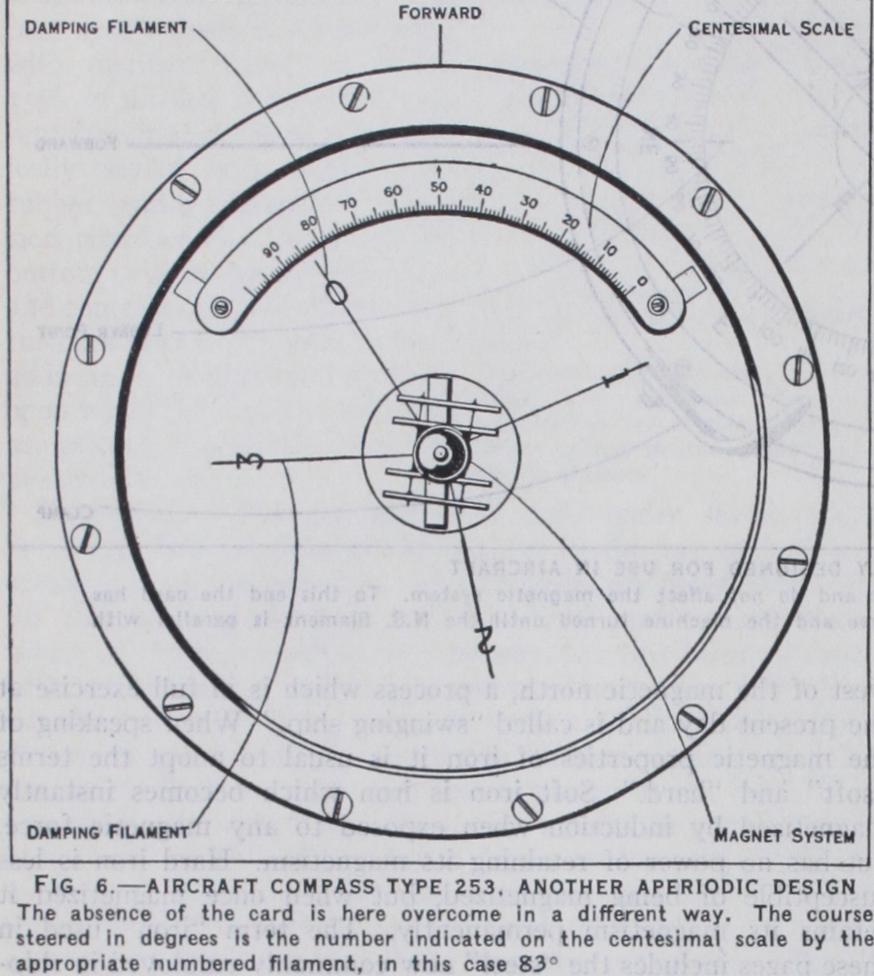 Without a card, however, it was difficult to use this instrument as a compass, and to overcome this, two very novel methods were introduced. In the first, a graduated ring was fitted to the top of the compass bowl, capable of being rotated and clamped in any position ; grid wires were fitted across the inner diameter, running from o° to i8o°. To use this instrument as a compass, the ring is rotated until the course required is opposite the lubber point when it is clamped; the head of the machine is then brought round until the N. S. filament of the magnet system is parallel to the grid wires.