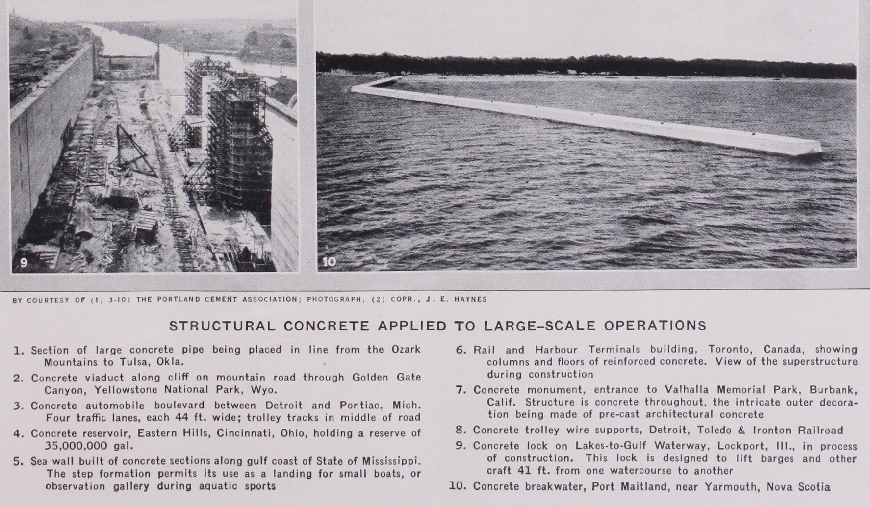 Dams, dock walls and graving docks are classes of structure in which concrete is used in enormous masses and where cyclopean concrete may often be used to advantage. In the case of a dam, various classes of concrete are used to suit the conditions in dif ferent parts of the work. In the heart of the dam, mass and weight are required, and proportions varying from i : 2 : 4 to I : 3 : 6 are commonly used. Watertightness is obtained by pro viding a richer and denser layer next to the water face with a mixture varying from i : i : 2 to i : 2 : 4. In the case of a high dam large compressive stresses will be developed in the concrete near the inner and outer surfaces at the bottom under varying conditions of water level, so that richer and stronger concrete may be necessary in these regions. Where climatic conditions are severe rich concrete may be necessary on all exposed surfaces and sometimes it is advisable to have the surfaces protected with a facing of granite or other durable masonry. Somewhat similar conditions obtain in the case of concrete for dock walls and graving docks. The construction should be watertight and sur faces exposed to wear and abrasion should be protected either by rich concrete or by a separate facing of granite or similar material. A number of dock walls have been provided with foundations in an interesting manner by sinking large cellular structures of con crete through the ground until a firm foundation is reached. Such constructions are known variously as caissons or monoliths and are usually built up on a metal shoe formed with cutting edges. The sinking is effected by excavating the earth from the cellular interior spaces by hand excavation or by mechanical means, using a grab. As excavation proceeds the structure sinks and at the same time building upwards with mass concrete or concrete blocks takes place so that the top is kept above ground level. When a firm foundation has been reached the interior spaces may be filled with concrete or the bottom may simply be plugged with concrete and the rest of the spaces filled with sand or broken stone. Such a foundation structure is generally used as a base on which to build a wall of mass concrete. In the case of breakwaters (q.v.) very large use has been made of concrete in the form of huge pre-cast blocks. Where the depth of water is not great the whole structure may be formed of such blocks, but more frequently their use is confined to the upper part of the construction resting on top of a broad bank of rubble deposited in the water. The blocks are made and cured in a large construction yard ashore and are handled and lowered into position by heavy travelling cranes and set into cor rect position by the aid of divers. At the port of Dublin, blocks of 35o tons weight were used which were handled and deposited by heavy floating sheers.