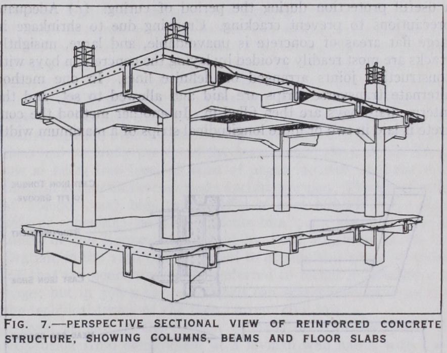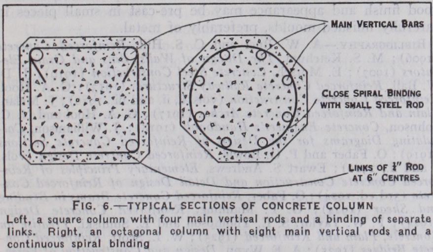 Columns.—A ferro-concrete column for the support of vertical loads, when properly designed and constructed, is at once econom ical. durable and fire resisting. It consists of a shaft of concrete containing a number of vertical steel bars bound together at close intervals by smaller steel bars either in the form of a continuous spiral or of separate links. The shaft may have any shape appro priate to the conditions and site. Sections of circular or octagonal shape are commonly adopted when spiral hooping is used, while square and rectangular cross sections are more commonly used with a binding of separate links. Typical cross sections of a square and an octagonal column are shown in fig. 6. The square column has four main vertical rods with a binding of separate links while the octagonal column has eight main rods with a continuous spiral binding. The thickness of concrete covering the main rods should in no case be less than i4in. The load is borne partly by the concrete and partly by the steel, the greater portion being usually allocated to the concrete. The distribution of the load takes place in accordance with the elastic properties of the materials, so that if the modular ratio (referred to above) is 15, each square inch of cross section of main steel rod will bear 15 times as much load as a square inch of concrete. Thus if the cross section of a particular column had 30o sq.in. of concrete and io sq.in. of steel, the steel would carry as much as 10 x 15 = 150 sq.in. of concrete and would therefore carry half as much as the actual concrete or one-third of the total load. If the average working stress on such a column were fixed at 5oolb. per sq.in. the capacity of the column for sus taining load would be ascertained thus:— It is seldom possible to arrange that columns shall be loaded uniformly over their cross section in the manner assumed in the foregoing simple calculation. In actual building construction they are usually employed to support ferro-concrete floors in a mono lithic construction whereby the bending of the floor beams induces bending effects also in the columns, which must be taken into con sideration along with the loads in determining the cross sections required. Fig. 7 is a perspective section showing a typical con struction in a building where the columns support main beams which in turn carry a series of subsidiary beams over which a slab floor is formed. It is readily understood that considerable labour is involved in fabricating and supporting the moulds for the beams in a construction of this type, and efforts at simplification have resulted in patented floors of the flat slab type in which all beams projecting below the floor slab are dispensed with and a thicker floor slab is supported directly on the columns through large cir cular or square capitals. Such a floor is usually reinforced by several systems of rods radiating from the columns and disposed near the under surface of the slab in the central portions of floor panels and near the top where they pass over the capitals. The design of floors of this type is based on approximate theory con trolled by the results of stress measurements in tests of actual floors. The method has hitherto found little application in Britain, where much more use has been made of light flat-ceilinged floors having in their lower part rows of hollow tile blocks set so as to leave intermediate spaces for the formation of narrow reinforced beams, the floor being completed by a continuous concrete layer placed over the tiles and beams. Floors of this type are well adapted for filling in the panels between the main floor beams of structural steel-framed buildings, and have the advantages of lightness and good insulating qualities, while a plaster ceiling can he applied to the grooved soffits of the tiles.