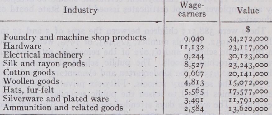 The World War brought a great volume of orders to Connecti cut factories and caused large numbers of plants to change the character of their products. In May 1918, 8o% of Connecticut's manufacturing was directly or indirectly engaged in producing munitions, rifles, machine guns, clothing and other articles used by the military forces, and there were five plants where ships and power boats were constructed. Wages were high during this pe riod. In the years of rapid expansion there were a great many strikes, and labour organizations increased in membership. During the two years following the armistice the factories began the proc ess of readjustment to peace-time conditions, which was com pleted by the depression of 1920-21. In 1922 the situation steadily improved; unemployment declined, and in Dec. 1922 the depart ment of labour reported an actual shortage of labour in the State. The growth of industry after 1922 was indicated by the fact that in 1923 and 1924 the cost of new factory construction and ad ditions was The 3,062 industrial establishments operating within the State in 1925 gave employment to 242,362 wage-earners, and had an output valued at $1,274,951,562. Connecticut's decrease in rank as a producer of textiles, especially cotton goods, was caused, in part, by industrial readjustments and, in part, by the increase in cotton manufacturing in the South. The leading manufacturing industries, the number of wage-earners employed and the values of their products in 1925 are shown in the table below.
