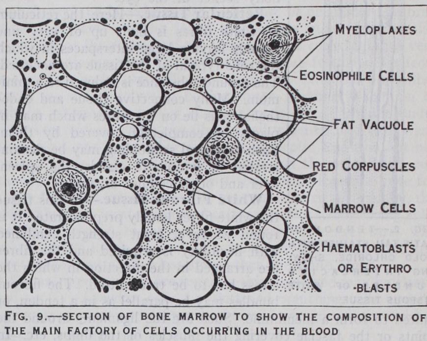 This fills the central cavity of tubular bones and the cavities of spongy bone tissue. It is largely composed of fat cells and is red or yellow in colour. Red marrow consists of fat cells lying in a tissue made up of large and small marrow cells and giant cells or myeloplaxes (fig. 9). The whole of these elements are supported in a delicate connective tissue. Some of the marrow cells are typical leucocytes and lymphocytes as found in circulating blood. Others (myelocytes) are larger than leu cocytes, with round or oval nuclei, and a protoplasm containing small or large granules. These different types of cell probably develop into leucocytes. The giant cells are large spherical cells with several nuclei. In addition to fully developed red blood corpuscles there are also present numerous young nucleated red blood cells (erythroblasts or haematoblasts).