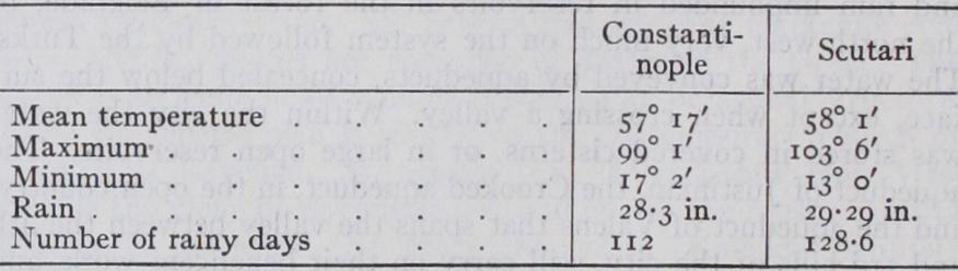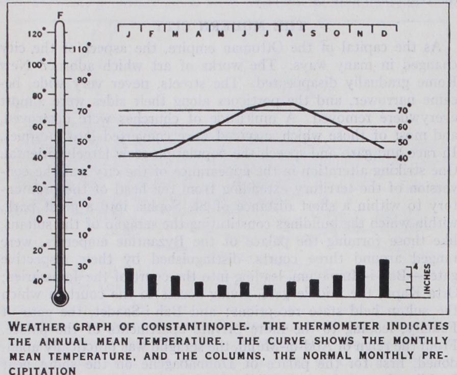 The city was supplied with water mainly from two sources; from the streams immediately to the west, and from the springs and rain impounded in reservoirs in the forest of Belgrade, to the north-west, very much on the system followed by the Turks. The water was conveyed by aqueducts, concealed below the sur face, except when crossing a valley. Within the city the water was stored in covered cisterns, or in large open reservoirs. The aqueduct of Justinian, the Crooked aqueduct, in the open country, and the aqueduct of Valens that spans the valley between the 4th and 3rd hills of the city, still carry on their beneficent work, and afford evidence of the attention given to the water-supply of the capital during the Byzantine period. The cistern of Arcadius, to the rear of the mosque of Sultan Selim (having, it has been estimated, a capacity of 6,571,72o cu.ft. of water), the cistern of Aspar, a short distance to the east of the gate of Adrianople, and the cistern of Mokius, on the seventh hill, are specimens of the open reservoirs within the city walls. The cistern of Bin Bir Derek (cistern of Illus) with its 224 columns, each built up with three shafts, and the cistern Yeri Batan Serai (Cisterna Basilica) with its 42o columns show what covered cisterns were, on a grand scale. The latter is still in use.' Byzantine Constantinople was a great commercial centre. To equip it more fully for that purpose, several artificial harbours were constructed along the southern shore of the city, where no natural haven existed to accommodate ships coming up the Sea of Marmora. For the convenience of the imperial court, there was a small harbour in the bend of the shoie to the east of Chatladi Kapu, known as the harbour of the Bucoleon. To the west of that gate, on the site of Kadriga Limani (the Port of the 'For the ancient water-supply see Count A. F. Andreossy, Constan tinople et le Bosphore; Tchikatchev, Le Bosphore et Constantinople (2nd ed. 1865) ; Forchheimer and Strzygowski, Die byzantinischen Wasserbilailter; also article AQUEDUCT.
