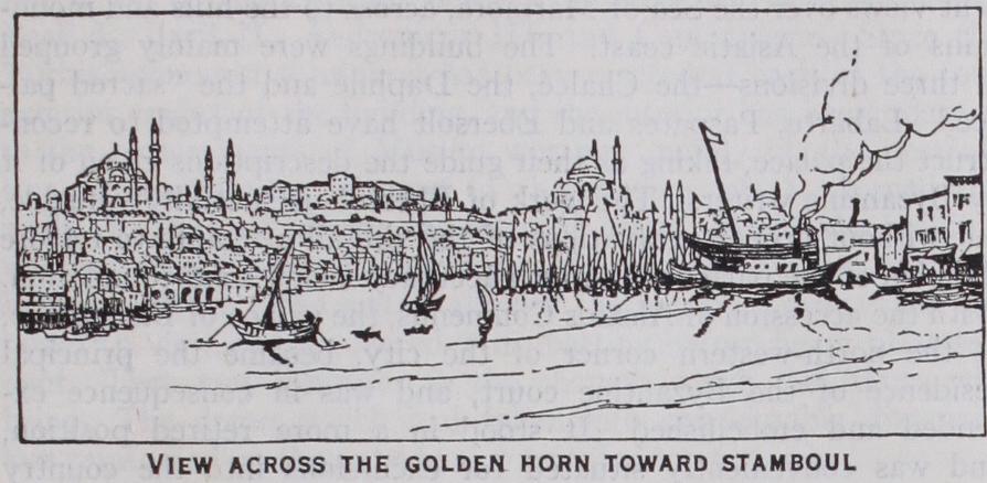 As the capital of the Ottoman empire, the aspect of the city changed in many ways. The works of art which adorned New Rome gradually disappeared. The streets, never very wide, be came narrower, and the porticoes along their sides were almost everywhere removed. A multitude of churches were destroyed, and most of those which survived were converted into mosques. In race and garb and speech the population grew largely oriental. One striking alteration in the appearance of the city was the con version of the territory extending from the head of the promon tory to within a short distance of St. Sophia into a great park, within which the buildings constituting the seraglio of the sultans, like those forming the palace of the Byzantine emperors, were ranged around three courts, distinguished by their respective gates—Bab-i-Humayum, leading into the court of the Janissaries; Orta Kapu, the middle gate, giving access to the court in which the sultan held state receptions; and Bah-i-Saadet, the gate of Felicity, leading to the more private apartments of the palace. From the reign of Abd-ul-Mejid, the seraglio was practically aban doned, first for the palace of Dolmabagche on the shore near Beshiktash, and then for Yildiz Kiosk, on the heights above that suburb. The older apartments of the palace, such as the throne room, the Bagdad Kiosk, and many of the objects in the imperial treasury are of extreme interest to all lovers of oriental art. The seraglio was thrown open to the public in 1926. Another great change in the general aspect of the city has been produced by the erection of stately mosques in the most commanding situa tions. The most remarkable mosques are the following:—The mosque of Sultan Mohammed the Conqueror, built on the site of the church of the Holy Apostles (1463-69), rebuilt in 1768 owing to injuries due to an earthquake; the mosques of Sultan Selim, of the Shah Zadeh, of Sultan Suleiman and of Rustem Pasha—all works of the i6th century, the best period of Turkish architecture; the mosque of Sultan Bayezid II. 0497-1505) ; the mosque of Sultan Ahmed I. (i6ro) ; Yeni-Valide-Jamissi 0 615-1665) ; Nuri-Osmanieh (1748-1755) ; Laleli- Jamissi 0 765) • The Turbehs containing the tombs of the sultans and members of their families are often beautiful specimens of Turkish art.