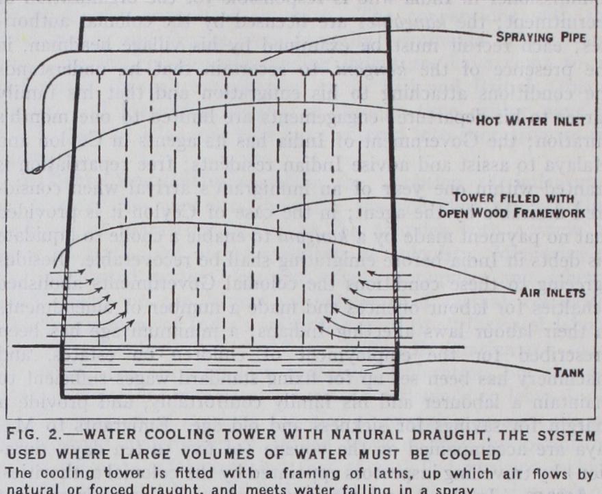 In the water cooling, the most suitable system, a jacket is cast around the cylinders, or made separately from thin sheet in aero engines. Two systems, the thermo-syphon and the pump are in use for passing the water through a radiator, which exposes it to large ,cooling surfaces, past which air is drawn by a fan. In the thermo-syphon method, the hot water from the jacket rises to the top of the radiator and, becoming cooled, sinks to the bottom and flows again to the jacket as illustrated in fig. 1. Refinements which assist in maintaining the required temperature in spite of weather and running conditions are the radiator shutter, adjusted over part of the radiator and the thermostat, which automatically operates the shutter. In large gas and Diesel engines the piston cannot suffi ciently be cooled by the transmission of heat into the cylinder walls, consequently a hollow water-cooled piston is used. Either pump or thermo-syphon flow is employed for these engines. Among other machinery that requires cooling are the cylinders for compressing air or ammonia, and parts of furnaces, such as tuyeres and hearth-jackets, which would otherwise rapidly burn away. Shaft and other bearings may have a much increased flow of oil, beyond that actually necessary for lubrication, if the speed is high or the shafts are big, or they may have water-cooling pas sages in the bearings. When a cooler deals with the oil in its course of circulation it may be of air-cooled pattern for aero engines, or water-cooled in other instances. The condenser is a specimen of cooling apparatus for steam, gas, ammonia, or carbon dioxide, and there are also the cold air and brine circulating sys tems around cold stores. Water has to be cooled in large volumes in several classes of plant, including condensing equipments and large internal-combustion engines. There are three methods em ploying, severally, a large reservoir, into which the water goes and cools by the surface area, a smaller pond with spraying devices, and a cooling tower filled with a framing of laths, up which air flows by natural or forced draught and meets the water falling in a finely divided state as shown in fig. 2. The spray pond has the water sprayed through a series of nozzles out over the water, the cooling effect being due to the water going up in the air in a finely atomized state.
