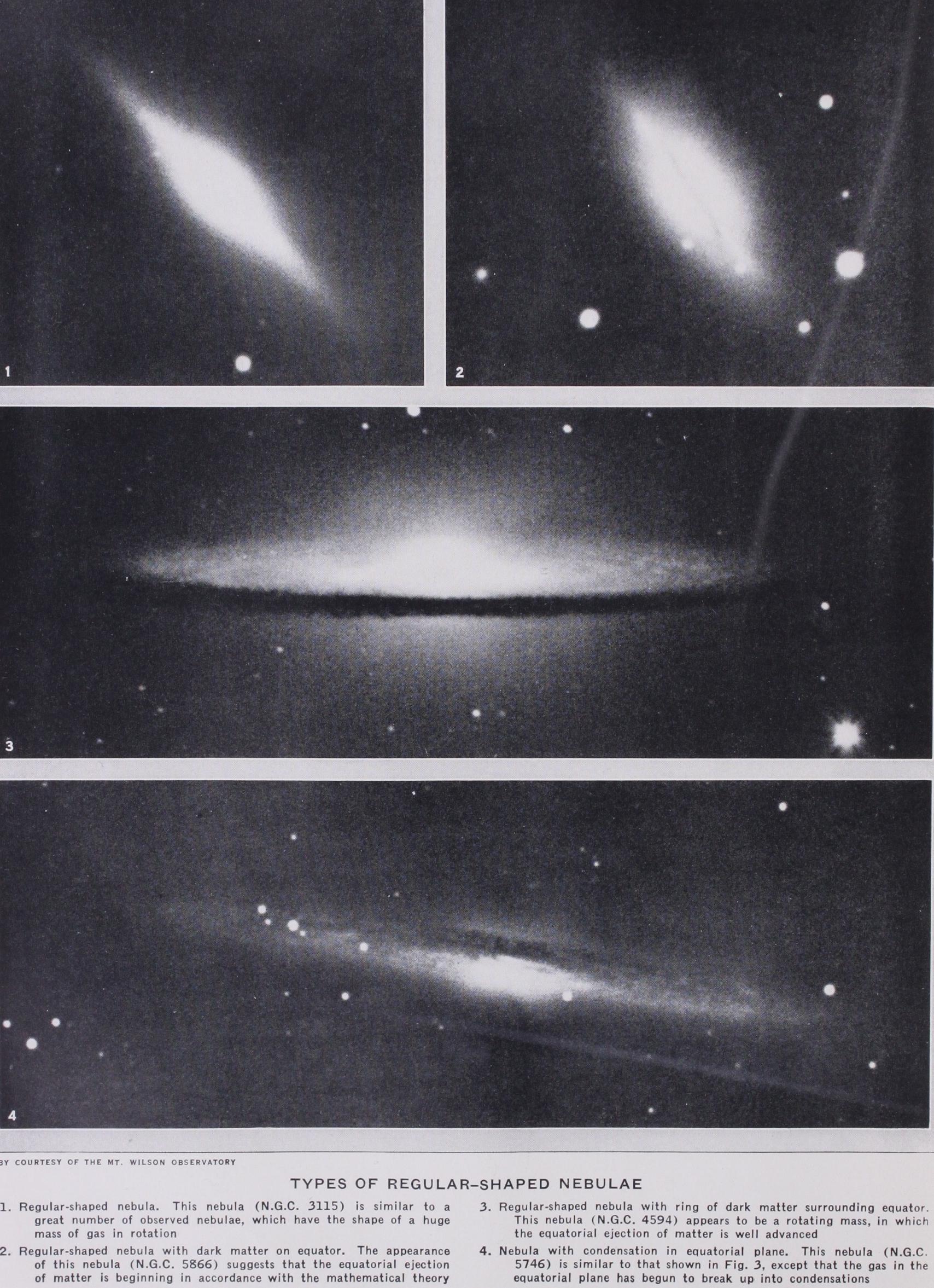 It will be seen that the sequence of figures shown in the first four examples is precisely that shown in the theoretical figs. 4 to 6. The series could easily be extended to include observed nebulae of the shapes shown in the theoretical diagrams i and 2, but such nebulae are not interesting objects photographically. Statistical researches by Hubble make it highly probable that there is a continuous sequence of nebulae having the shapes shown in the theoretical diagrams r to 6, only the last half of this series being exemplified by the photographs shown in Plate I. The last photo graph of all on this plate shows a nebula of the same general type viewed from another angle; there is little room for doubt that this nebula is physically very similar to that shown in fig. 5, the difference in appearance arising solely from the different angle of view.