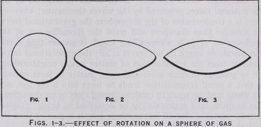 When a disturbance is produced in the earth's atmosphere, as for instance by firing a gun, waves of sound carry the energy of the disturbance to great distances in the form of waves of alter nate condensation and rarefaction, the rate of travel being the same for waves of all wave-lengths. Let us now imagine an atmosphere or other mass of gas extending for millions of millions of miles, and disturbances of wave-length millions and millions of times as great as that of terrestrial sounds—let us, in brief, imagine phenomena on the astronomical instead of on the terres trial scale of magnitude. The gravitational attraction of the various parts of the atmosphere on one another now becomes very important, and shows its importance by causing waves of different wave-lengths to travel at different speeds. The waves of short wave-length all travel at the same speed, this being the speed at which they would travel if gravitation were non-existent, but the longer waves find their speed of travel retarded by the gravitational forces produced by the waves themselves ; wherever there is a condensation of the atmosphere the gravitational forces are stronger than elsewhere and resist the spreading out of the condensation. Finally waves whose length is greater than a cer tain calculable length do not travel at all; the gravitational forces resulting from the accumulation of matter in one neighbourhood are so great as to draw more and more matter in from outside, so that a small accumulation tends to form into a big one, and the whole medium tends to condense round clots or condensations. The medium may appropriately be described as being "gravita tionally unstable" for all waves whose length is greater than the critical calculable length.