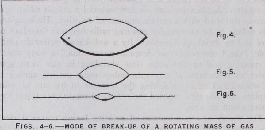 Mathematical theory further shows that when once the lens Shaped figure has been attained, any further increase in the speed of rotation results in matter being thrown off from the sharp equator. The mass is now rotating so fast that its gravitational attraction is inadequate to retain the outermost particles on the equator against the centrifugal tendency set up by rotation, and they are thrown off into space. No matter how much the rotation is increased, the sequence of events remains the same. At each stage the sharp edge acts like a safety-valve, ejecting just so much matter as is necessary in order that the remainder may be able to rotate as a lenticular mass with a sharp edge.