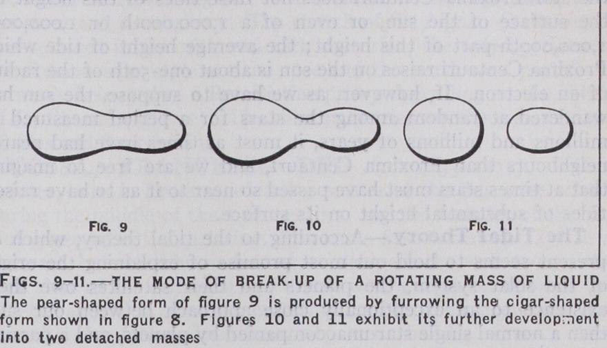 The sequence of events is indicated in figs. 7-11, although it must be added that the last two of these figures are largely con jectural, and take us entirely beyond the reach of exact mathe matics. But there would seem to be little room for doubt that the final product of a liquid star which has shrunk while rotating is a system of two liquid stars which revolve about each other in nearly circular orbits.