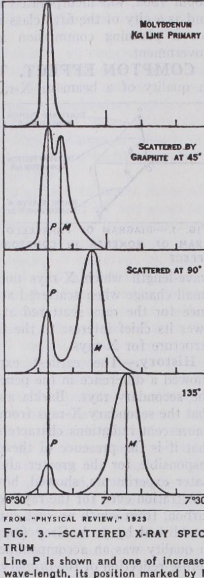 Fig. 3 compares the spectrum of the primary X-rays with the spectrum of these rays after they have been scattered by a block of graphite. The upper curve shows a prominent line in the X-ray spectrum of molybdenum. The lower curves show the spectrum of these rays after being scattered from graphite at three different angles. In each case, in addition to a line of the original wave length, there appears a more prominent line of increased wave length. Measurements on spectra of this type have shown that the difference in wave-length between the two sets of lines is given accurately by the formula 2.42 X 1 X (1 — cos4) cm. as predicted by the photon theory.