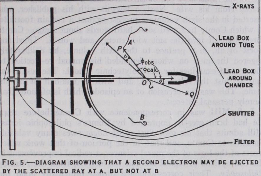 The corpuscular character of the scattered X-rays is shown most clearly by tracing the path of a photon after it has collided with an electron. This has been done (Compton and Simon, 192 5) in the manner shown diagrammatically in fig. 5. A feeble beam of X-rays is admitted into a cloud expansion chamber of the type devised by Wilson to show the trails left by fast moving electrons. A photon is scattered by an electron at 0, and the trail of the electron as it recoils is visible. If it starts along the line OQ, the X-ray particle must have proceeded in the direction OP, determined by the usual mechanical laws of elastic collisions. The deflected photon can make itself visible by exciting a second high speed particle before it escapes through the wall of the chamber. The track at A represents such an occurrence. When such a sec onci track appears it is possible to trace the path followed by the X-ray particle after its collision with the first electron. If the scattered X-rays did not consist of particles, but were propagated as waves spreading in all directions, when a second electron ap pears, there is no more reason why it should occur at A than at some other position such as B. The fact that in the experiments the scattered ray excited secondary electrons near the line OP, determined by the angle of recoil 0, means that the X-rays go in definite directions.