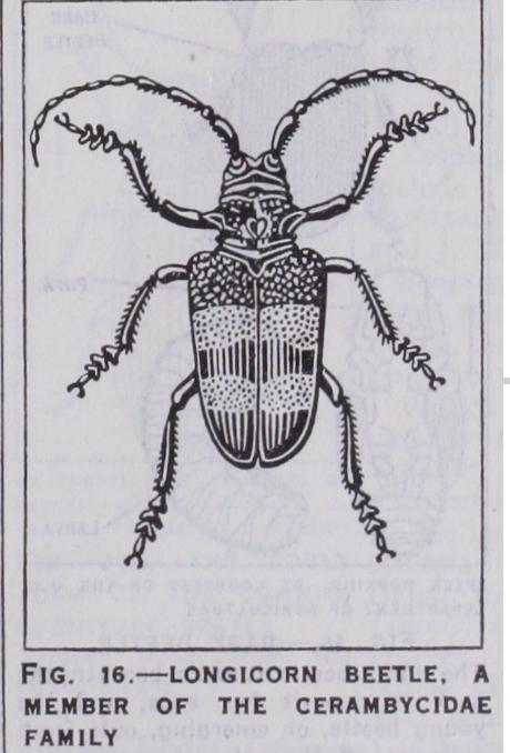 The Scarabaeidae (fig. 20) number over 14,000 species : the rose chafer, cockchafer and the "dor" beetles are familiar ex amples, while the sacred beetles or scarabs of ancient Egypt also find their place here. They are somewhat convex with very short antennae which are not elbowed, and the elytra do not cover the apex of the abdomen. The Scarabaeus has been studied by J. H. Fabre and the female beetles collect dung into balls which they roll along the ground and store in the earth as food for themselves and their larvae. The African goliath beetles (fig. 21) are among the largest of all insects. The larvae in this family feed upon dung, rotting wood, etc., or at the roots of plants : the latter habit prevails among cockchafers and great in jury to crops may result.