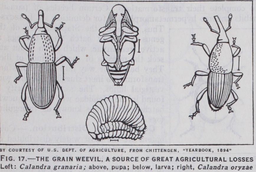 Some species, such as certain bean weevils and the cotton boll weevil, may complete their life-cycle in a few weeks, and there results a number of broods in the year : the same remark applies to certain beetles living under warm conditions in stored grain. On the other hand, the cockchafer and stag beetle require several years to complete their transformations. Certain beetles of parasitic habits undergo hypermetamorphosis (for definition see INSECTS). Thus, some of the Staphylinidae of the genus Aleochara hatch from the egg as active free larvae, which roam about and seek the puparia of certain kinds of flies. They bore their way into their hosts and transform into inert sluggish maggots with vestigial limbs. The same peculiarity is found in the Meloidae whose active newly hatched larvae are known as triungulins (see above) .