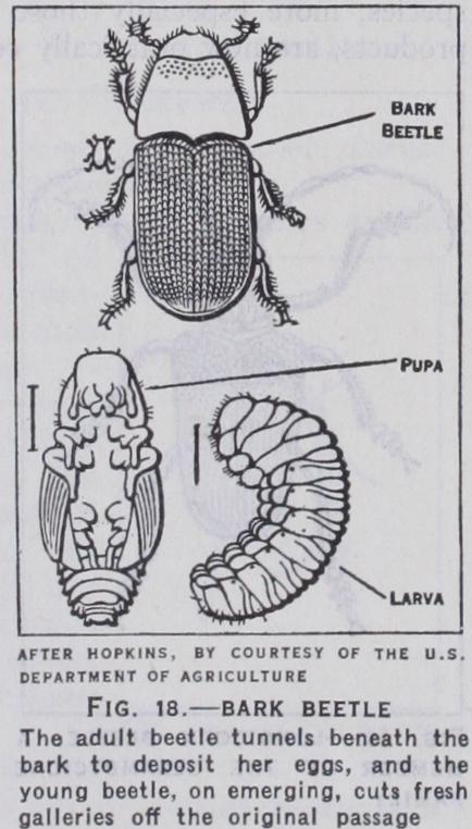 Various members of the Scolytidae (bark beetles) are wide spread pests of forest trees : one species (Xyleborus fornicatus) is the shot-hole borer of tea in Ceylon. Larvae of many Ceram bycidae (longicorns) are also destructive to living and dead tim ber, while species of Anobium and Xestobiurn (death watch beetles) bore into furniture and the rafters of public buildings (fig. 25A) : the powder post beetles (Lyctidae) have very similar habits. Many beetles also attack stored grain, meal and other dried products, no tably the granary weevils (Calandra) and the meal-worms and their allies (f am. Tenebrionidae).