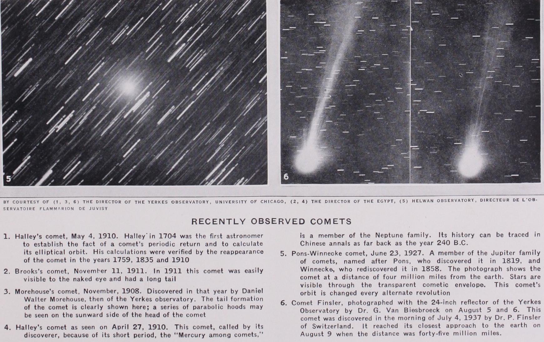 There are two ways in which comets may cease to exist as such. Either the meteors in the head may lose all their gas (this appears to be the case with Biela's) or these meteors may become so diffused and scattered as to lose all semblance of unity and coherence. We have no actual experience of the dissolution of a comet in the latter manner; in fact the coherence of the heads of some comets is surprisingly great, and seems to indicate some unknown force holding the constituents together. Thus the comet Pons-Winnecke has been known since 1819, and has made sev eral close approaches to Jupiter; further it has given rise to a meteor shower, which was well seen in June 1916. Yet when the comet approached very near the earth, in June 1927, its nucleus was seen to be very small, not more than two miles in diameter according to Prof. V. Slipher and M. Baldet.