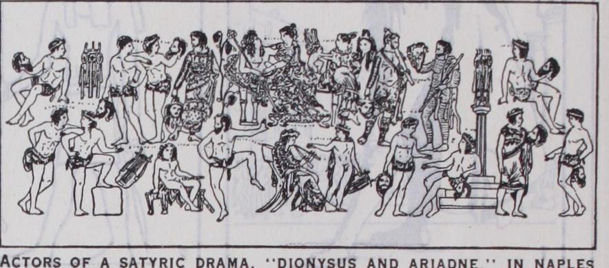 Everything about the costumes was traditional. If the play was a tragedy the actor wore an underdress or chiton, over that a draped gown, also a gold embroidered overdress. In addition to the dress proper, there were various hand properties, crowns, etc., which made it possible to distinguish the characters one from an other. Dionysus is reported to have worn a yellow overdress, a shoulder strap with flowers and a thyrsus. Other gods had their own attributes. If a character were supposed to be unfortunate he used dingy clothes, grey or faded blue, black or murky yellow. Queens were supposed to wear white and purple, other ladies saffron or frog green, these costumes being lavishly embroidered with gold. Satyrs wore goat skins, real or imitation panther skins, phallic attributes and red overdresses. The sileni wore, besides their tails, a curious underdress. In comedies the actors wore the chlamys over a plain white underdress, together with travelling hats and hair bands, and had properties such as bows, spears, knives, staffs, etc., to complete the costume. The number of masks were regulated by the Greeks also, apparently in a much more arbitrary way than among the Chinese. According to Pollux there were six old men, eight young men, three attendants and II women, making 28 in all. In the New Comedy there seem to have been nine old men, I I young men, seven slaves, three old women, 14 young women. The costumes also were very conven tional. The richness of the cos tumes, especially of the chorus, depended much on the wealth and good will of the choragus, who financed the performance sometimes as a civic duty which was laid upon rich citizens, but much more often for the glory which a successful production brought to the backer.