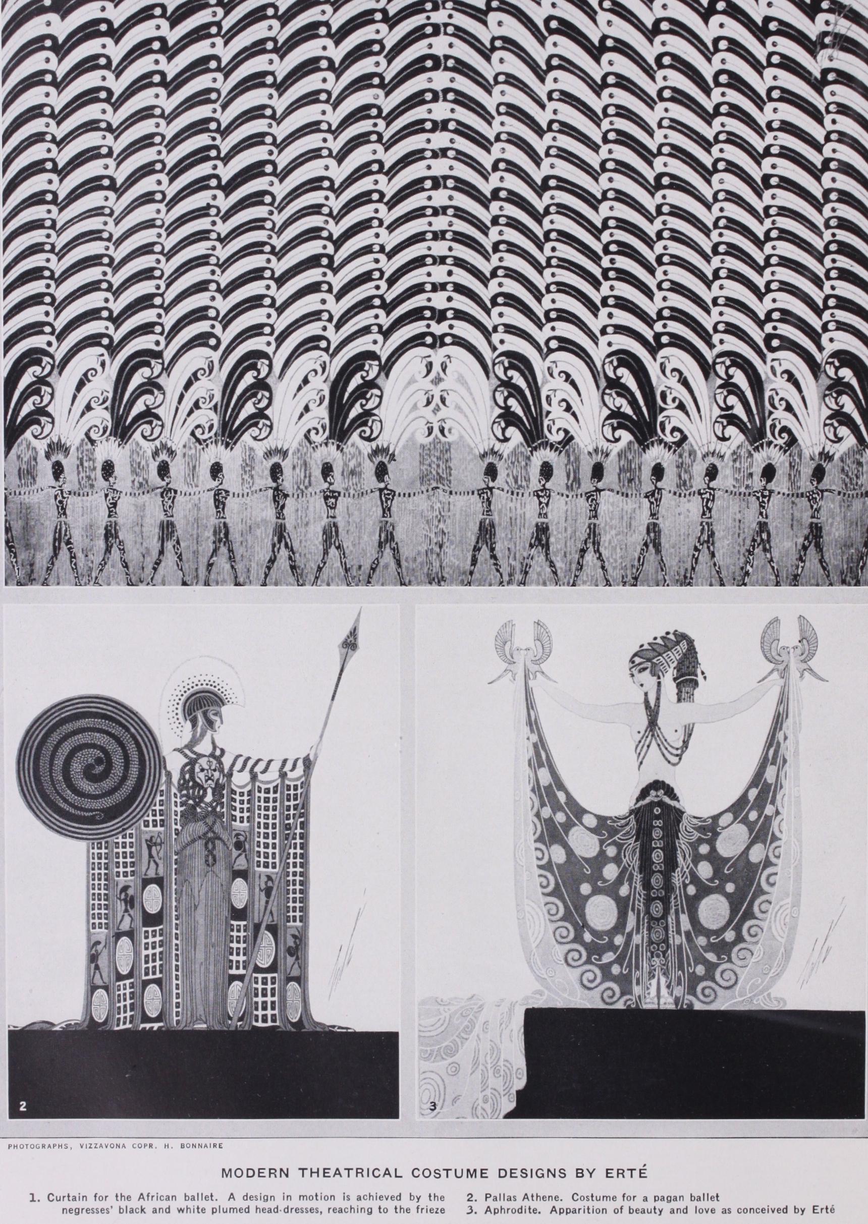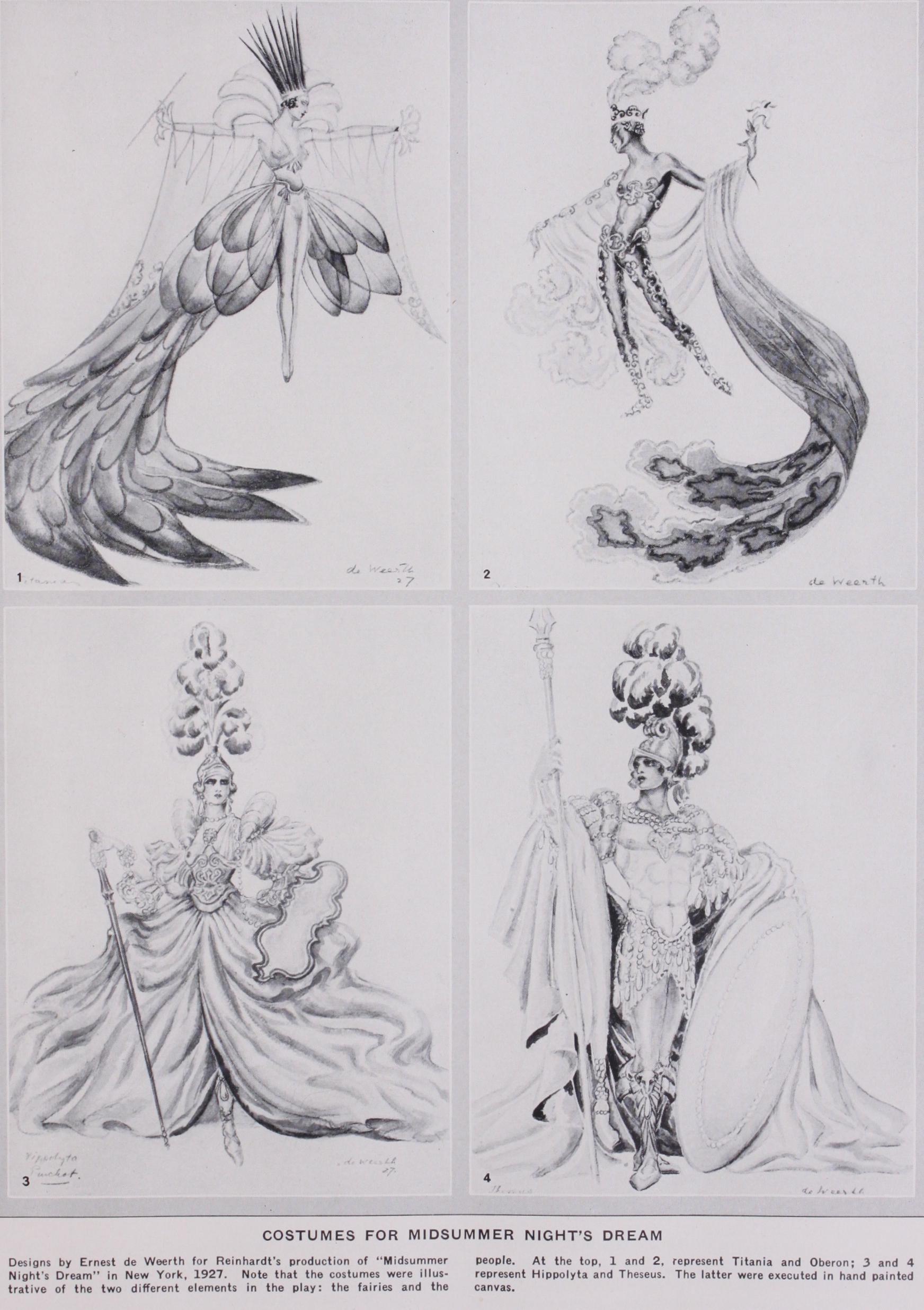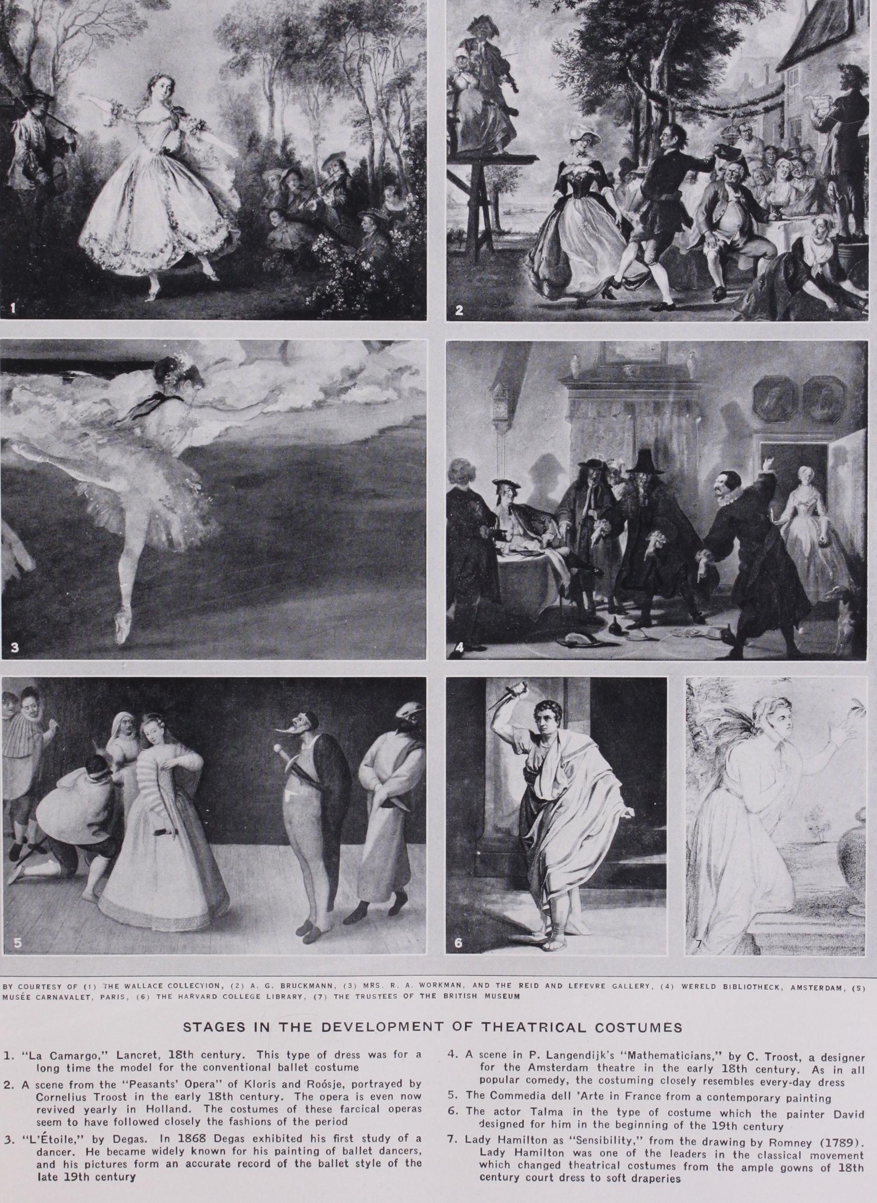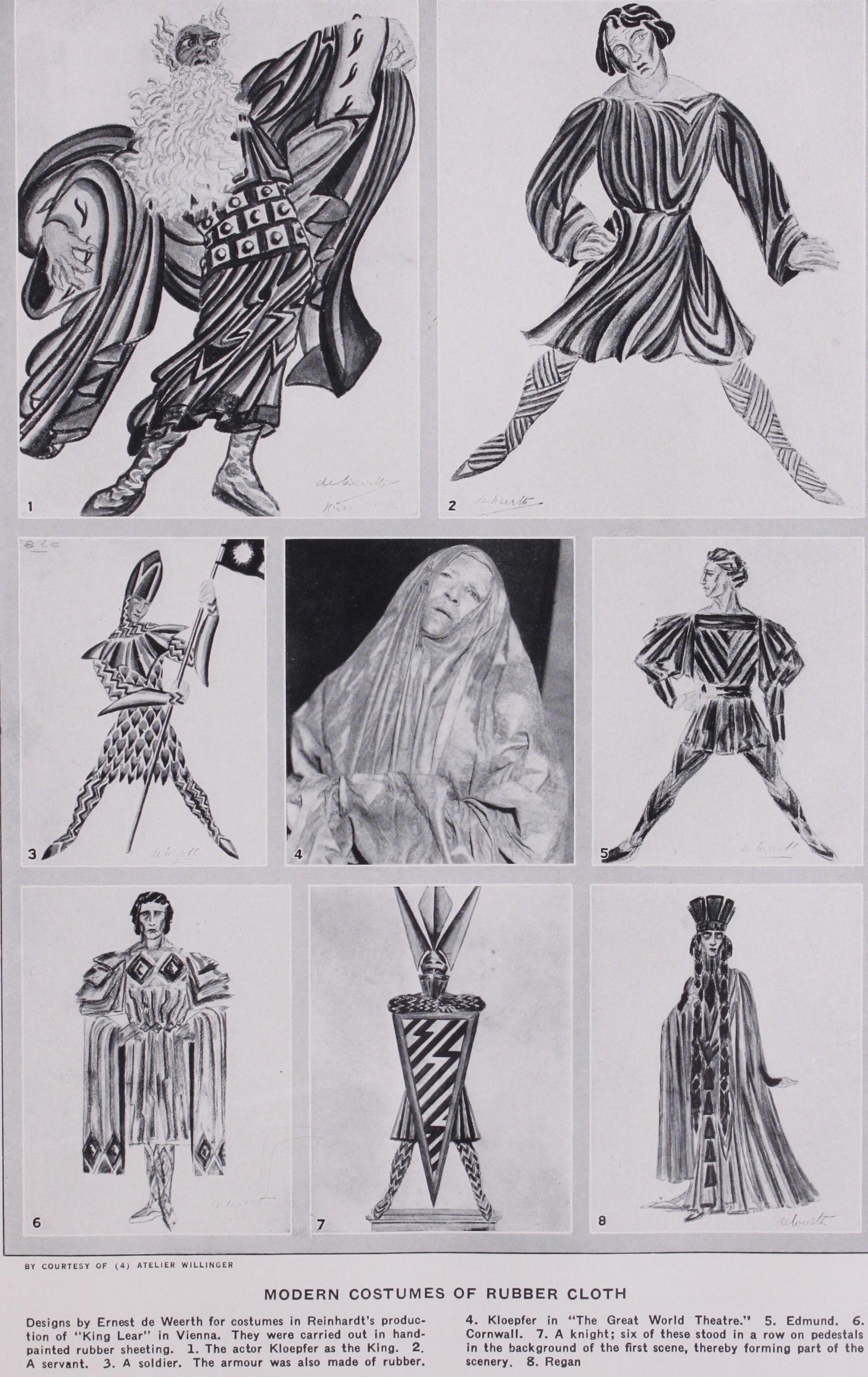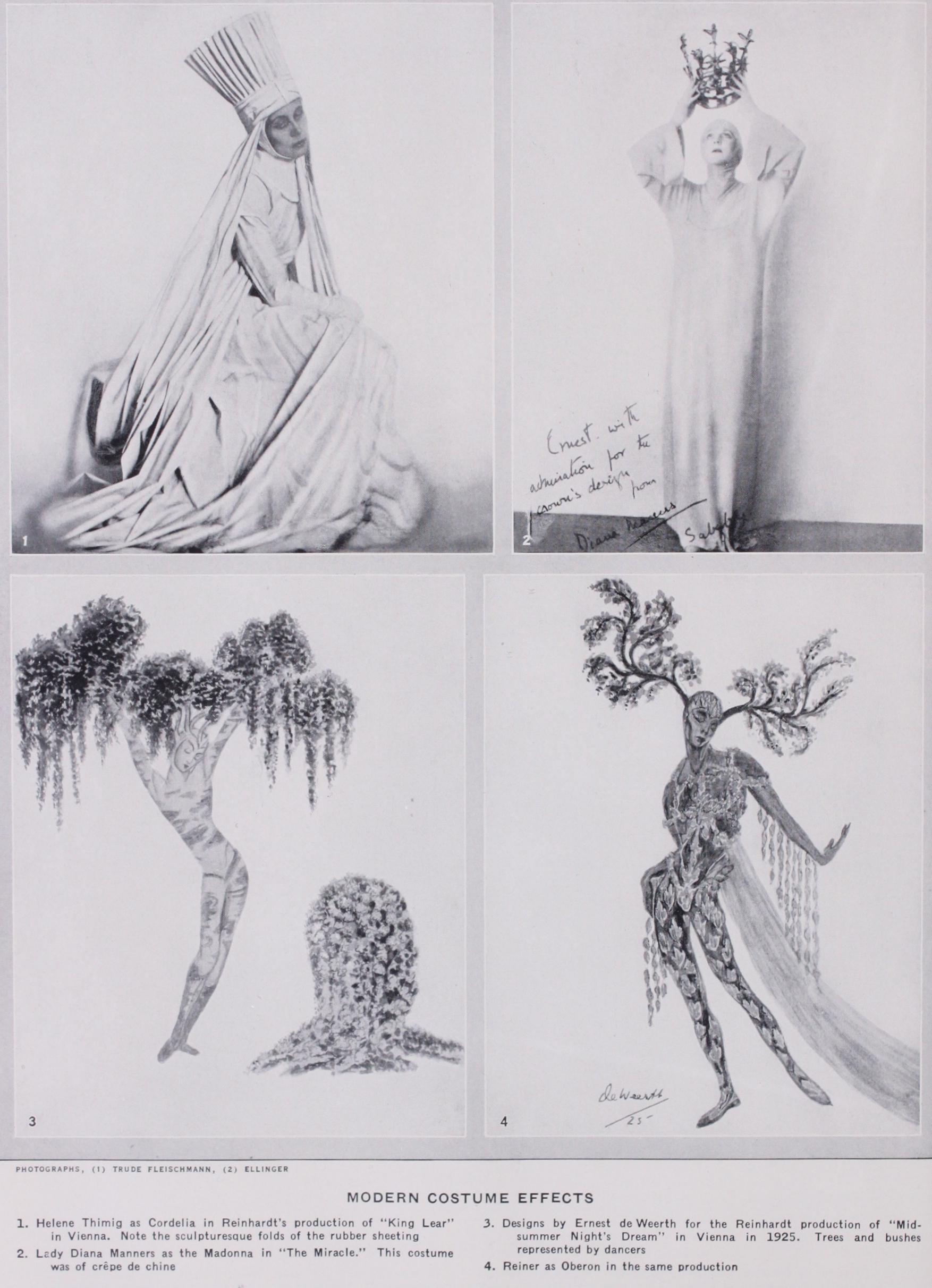From the time when Henry Irving ployed artists of fame to design the tumes and scenery for some of his ductions there has been a strong tion among managers, one trying to outdo the other in the artistic excellence of the costuming of the plays which he produces. Of course, the results vary enormously. The famous Meiniger troupe prided selves on the historical accuracy of their costumes. Men of the type of Tadema combine historical accuracy with a definite attempt to secure artistic mony. Others, like the Russian Bakst, sacrifice historical accuracy to the artistic conception, being chiefly concerned with the composition in colour, form and line. Attempts have been made to reduce the actor to a two dimensional figure by means of lighting, and even to annihilate him, as far as his value in the composition is cerned, and use him as an intelligent chine, animating the abstract composition of colour and form which he carries by way of dress. It is curious to notice how one of the best known of the modern painters, Paeblo Picasso, resorts to the same methods which were used by the i6th and 17th century designers in their emblematic costumes. The only difference lies in the artistic approach to the emblems combined to form the costume.