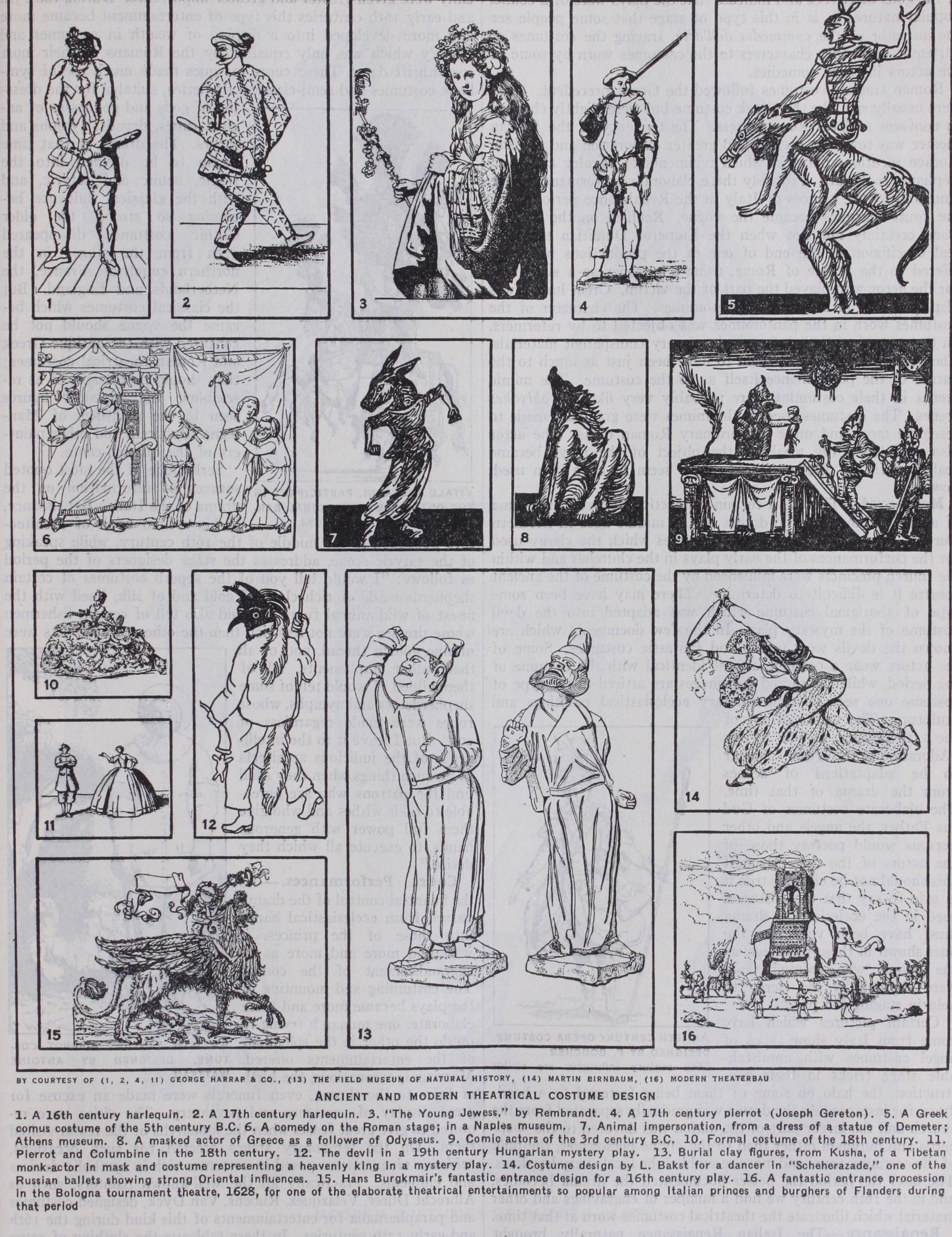 COSTUME DESIGN, THEATRICAL. The early his tory of theatrical costume can no more be separated from that of religious and ceremonial costume than the early history of drama as a whole can be separated from the history of religion, which merges by slow degrees into drama. The first steps away from religion proper are usually taken in the direction of comedy, many gods becoming the clowns of future generations. The Etruscan devil dancer may easily be the descendant of a powerful god to whom bloody offerings once were made; yet the lineal descendant of this god played a clown's part as recently as so years ago in a Hungarian mystery play.