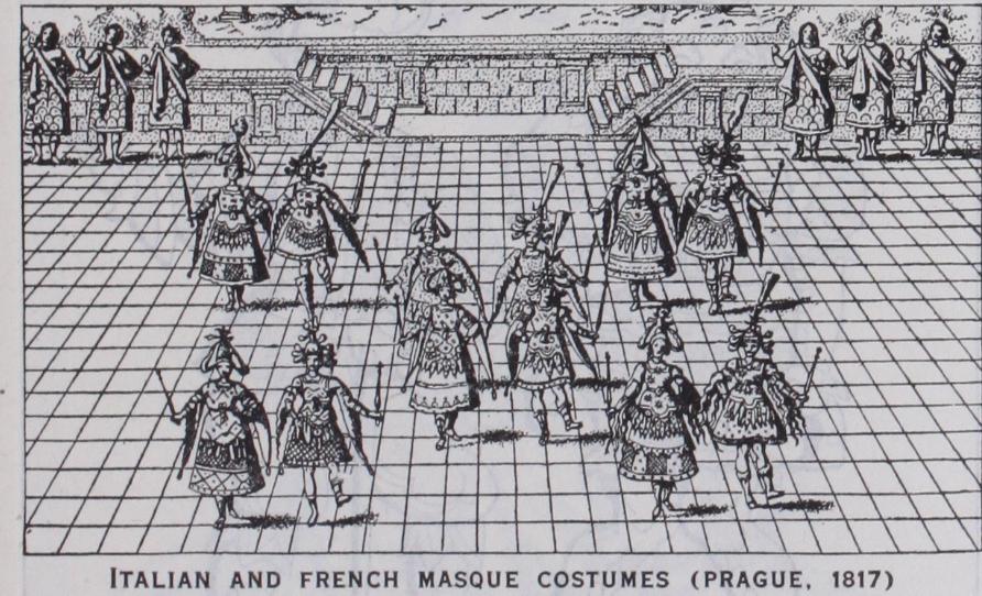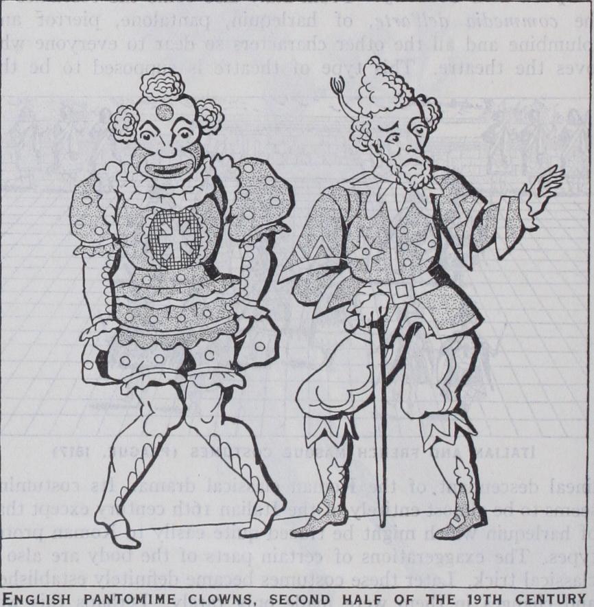 The Flemish rhetoric drama was costumed in a Dutch version of the Italian classical period, and so were the court entertain ments in England. Inigo Jones, who together with Ben Jonson produced several masques, studied in Italy, and followed the Italian fashion rather closely. A few drawings of his are preserved at Oxford, among them some of the very few drawings of cos tumes of characters in Shakespeare's plays. In some of the productions in the London theatres of the early 1 7th century the costumes were probably imitations on a more modest scale of those worn in the court productions. In others the costumes, judging by some woodcuts which have come down to us, were like the everyday dress. Ben Jonson thus describes the costumes in the masque of queens : "The habits had in them the excellency of all devices and riches and were worthily varied by his inven tion," i.e., Inigo Jones's invention.