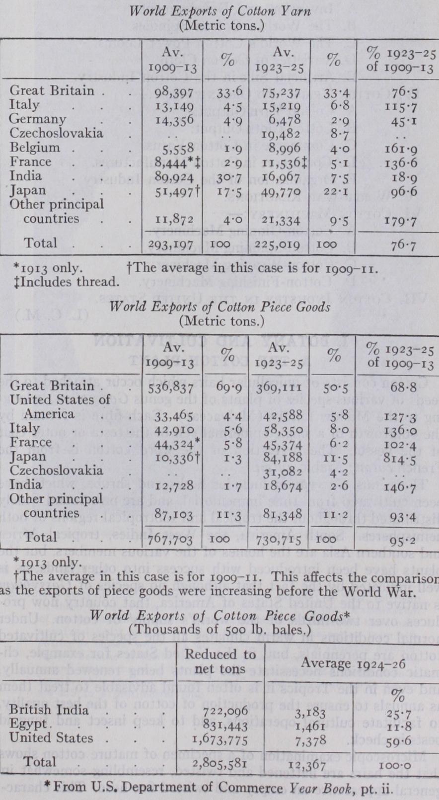 After many years, and even after the hazards and dislocations of the World War, the cotton industry still plays a great part in the British economy, but its relative importance has considerably decreased. In the world as a whole, too, the British cotton in dustry, although still supreme, has lost something of its pre dominance. If we look at the cotton spindles record, we see how great a change has taken place in the relative positions of the chief nations in this matter. At the close of the i 9th century, tak ing the average of the five years 1895-99, Great Britain possessed more cotton spindles by far than all the rest of the world put together; in spindles out of a world total of 164,616: The World's Cotton Spindles (in Thousands) Thus, Great Britain began 1927 with rather more than one-third The British exports of cotton piece-goods suffered very seri ously, it will be seen, between 1909-13 and 1923-25. The world trade in cotton piece-goods dropped by 5%, while the British share of the whole fell from 7o% to 5o.5 %. The greatest loss was in the Far East; in 1926 Great Britain exported to that market only 44% of the yardage she supplied in Thus the post-war period has been for the cotton trade one of deeply interesting development. The great changes that have occurred in the industry in Great Britain, Europe, the United States and elsewhere; the enhanced cost of cotton, the variations in popular taste, the introduction of artificial silk and other fac tors are examined in the following sections, which have been planned to survey the entire field of the industry, from the culti vation of the cotton plant to the manufacture of the ingenious machines used in the cotton industry. The sections will be found in the following order :—