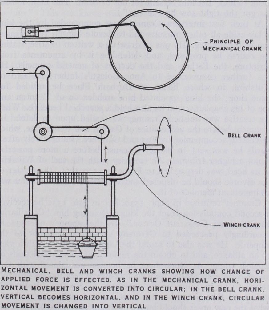 CRANK. In mechanics, a crank is a device by which recip rocating motion is converted into circular motion or vice versa, consisting of a crank-arm, one end of which is fastened rigidly at right angles to the rotating shaft or axis, while the other end bears a crank-pin projecting from it at right angles and parallel to the shaft. When the reciprocating part of a machine, as the piston and piston-rod of a steam engine, is linked to this crank by a crank-rod or connecting rod, one end of which works on the crank-pin and the other on a pin in the end of the reciprocating part, the to-and-fro motion of the latter imparts a circular motion to the shaft and vice versa. The crank, instead of being made up as described above, may be formed by bending the shaft to the required shape, as sometimes in the handle of a winch. A bell-crank, so called because of its original use in bell-hanging to change the direction of motion of the wires from horizontal to vertical or vice versa, consists of two arms rigidly connected at an angle, say of 9o°, to each other and pivoted on a pin placed at the point of junction.