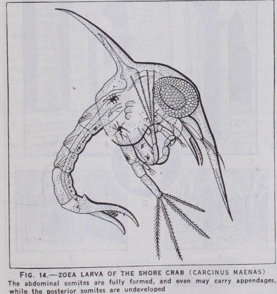 The course of development here outlined, in which the somites and appendages appear in regular order, agrees so well with that observed in the typical Annelida that it must be regarded as the most primitive. It is most closely followed in some Branchiopoda and Copepoda. In most Crustacea, however, this primitive scheme is more or less modified. The earlier stages may be passed through within the egg, so that the larva, on hatching, has reached a stage Fossil remains of Crustacea are abundant in strata belonging to all the main divisions of the geological time-scale from the most ancient up to the most recent, but they teach us disappoint ingly little regaruing the phylogeny of the class. This is partly due to the fact that many important forms must have escaped fossilization altogether owing to their small size and delicate structure, while very many of those actually preserved are known only from the carapace or shell, the limbs being absent or repre sented only by indecipherable fragments. The fortunate accident which has preserved with marvellous completeness the minute branchiopod Lepidocaris in the rhynie chert (old red sandstone) is not likely to have been often repeated. But Lepidocaris is of recent date as compared with the varied fauna of Crustacea dis covered by Walcott in the Middle Cambrian of the Canadian Rockies and there is reason to believe that many of the chief groups were already differentiated before the beginning of the geological record as we now know it. Shrimp-like forms that can be definitely referred to the Malacostraca begin to appear in the Upper Devonian and Mysidacea and Syncarida can be recognized in the Carboniferous, but it is not until true decapods appear in the Trias that anything like a connected story can be made out.