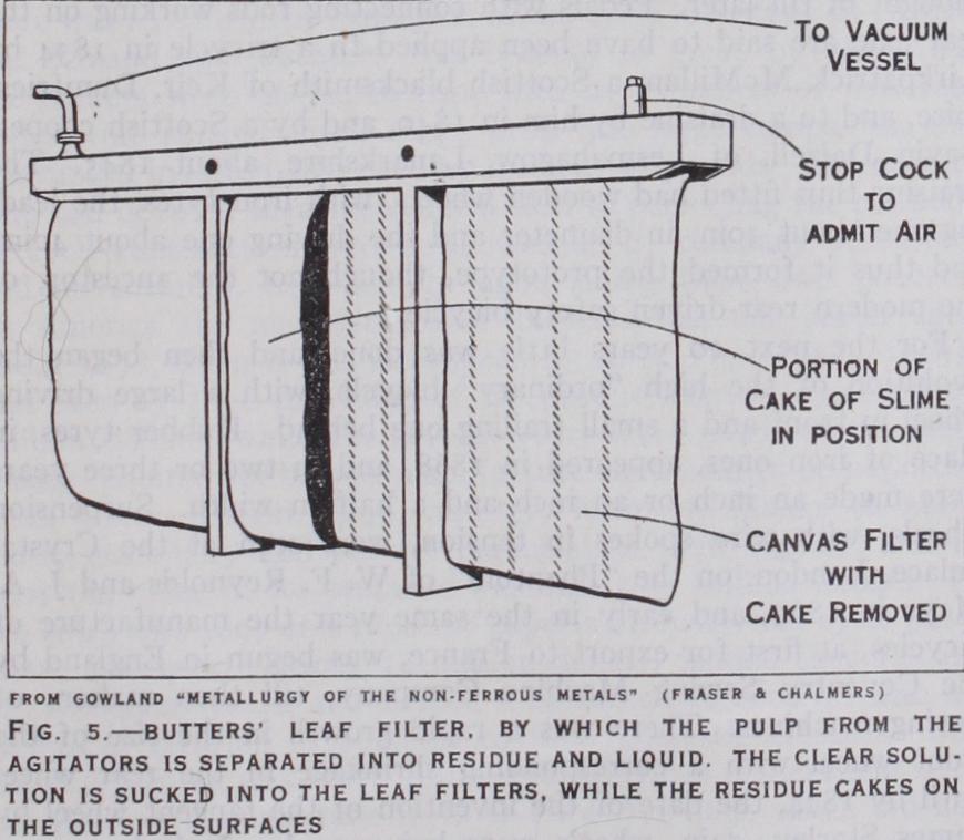 For the recovery of the gold from the cyanide the dissolved air is first removed from the clear solution by applying a vacuum to thin streams of the liquid (Crowe process) . The solution is then mixed with zinc dust and the gold precipitated as black slime (not to be contused with the ore-slime mentioned previously), while most of the zinc is dissolved. The gold-slime is then filter-pressed in leaf filters and the clear cya nide solution separated in them is conveyed to a storage tank for use again after it has been re aerated. The gold-slime is purified by furnace methods and is finally melted and cast into bars.