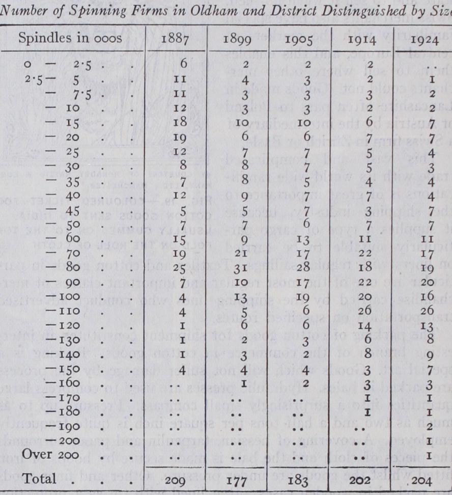 The purely productive concerns in the cotton industry shelve much of their commercial risk and thus facilitate the growth of large scale businesses. A spinner, through the use of the "futures" market and the purchase of cotton "on call," can move on to other shoulders the risks of price fluctuations in his raw material. He is not called upon to grant long credits on the yarn he has sold. The weaver also does not work to stock to any great extent; his commercial risks are taken by the shipping merchant, who gives a contract for the cloth to be woven and finances it during the finishing stages, giving the weaver prompt payment. The increase in size of the business unit is shown clearly in the results of an investigation made among the Oldham spinning firms by Mr. T. S. Ashton, of Manchester university.