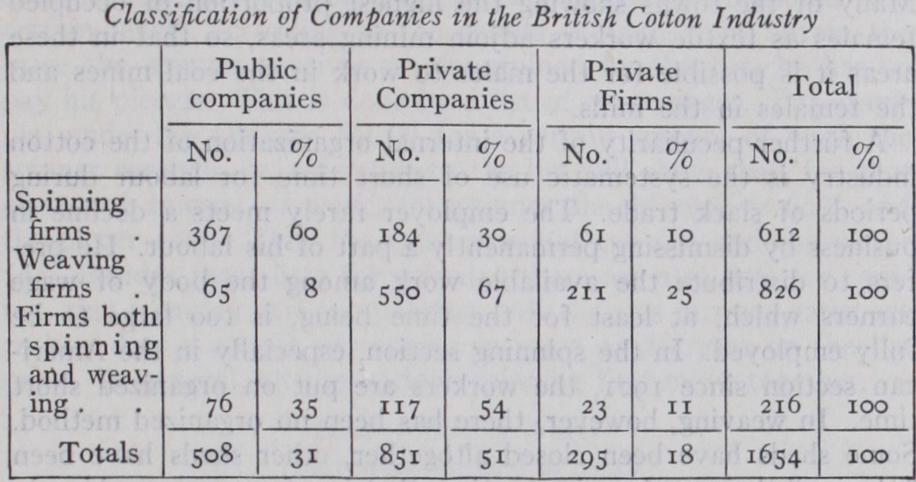 Another aspect of the specialization which must be regarded as characteristic of the industry is seen in the sharp distinction be tween spinning and weaving firms. As a general rule a firm con fines itself to spinning or to weaving, whilst the number of "com bined" firms, both spinning and weaving, is small. The following table, based upon the evidence given by the Manchester Chamber of Commerce before the Company Law Reform Committee, 1925, brings out this point clearly.