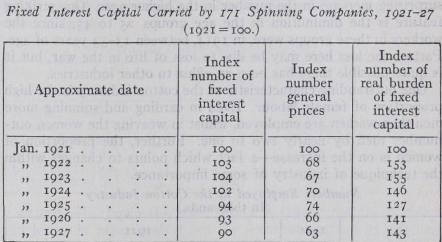 Businesses which have a large proportion of capital in forms upon which fixed interest must be paid are peculiarly susceptible to movements in general price levels. A fall in price increases the real burden of the fixed money sums which are to be paid in inter est ; a rise in price creates a corresponding advantage, but it also encourages the business reaping the advantage to capitalize and often over-capitalize this gain. Thus although, taking Jan. 1921 as a base (= r oo), the total fixed interest capital of 171 spinning companies had fallen to 90 in Jan. 1927, yet, by making allowance for price changes in the interim the real burden of the interest charges had risen from r oo to 143. The following table shows this.