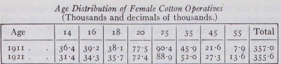 Nevertheless, the decline in numbers employed since 19 r 1 has resulted in a changed age distribution of workers, especially in the case of male workers where there has been the greatest decrease. The age distribution of male and female workers as shown by the census figures of r021 are set forth in the tables herewith_ The effect of the general decline in numbers is evidenced by the decrease in the age groups below 25, but there has been a rather surprising increase in the number in the higher ages. One striking feature is the diminution in the age groups 25 to 45, since the workers in these groups were, in 1914, between 13-33 years of age. Part of the loss here may be due to loss of life in the war, but it is quite possible there has been an efflux to other industries.