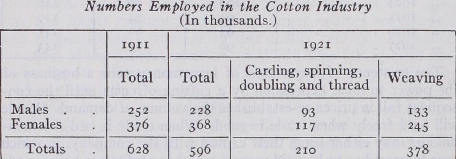 Labour.—In 1921 there were 596,00o men and women in the cotton industry of Great Britain. Thus, in numbers employed, the cotton industry is only half the size of the coal industry, but more than twice the size of the woollen industry. By com parison of the census figures of 1911 and 1921 a decrease of 32,00o workers, mostly men, is shown in the industry. This de cline is partly due to the loss of male labour and the decrease in the number of new entrants during the war, and the increased use of female labour, either to replace absent men or to meet the con ditions following the increased use of the ring spindle. The depres sion after 1921 probably caused some reduction in the total num bers engaged in the industry. Although no figures are obtainable which are directly comparable with the census figures, the tend ency is revealed in the annual statements of the Ministry of La bour as to the total number of insured persons in the industry. Actually there has been little change since 1923.