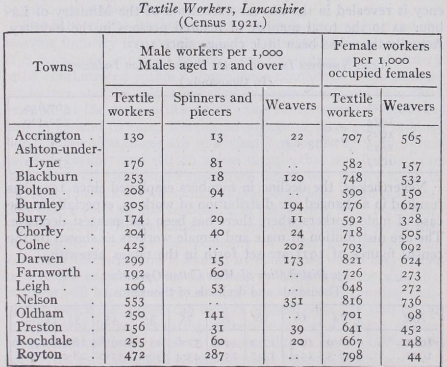 Weaving is so largely a woman's occupation that even in such distinctive spinning towns as Oldham and Bolton, female weavers outnumber female spinners and piecers; in Bolton by almost four to one. It is natural, therefore, that it should be in the weaving areas that the largest proportion of occupied females are em ployed as textile workers. One further fact should be noticed. Female textile workers are not so much concentrated in the smaller towns as in the case of male, while, in certain areas, es pecially in the coalfields, they are found in large numbers. There is a special association between mining and textile manufacture. Many of the towns showing the highest proportion of occupied females as textile workers adjoin mining areas, so that in these areas it is possible for the males to work in the coal mines and the females in the mills.