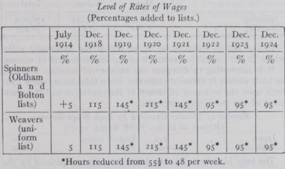 In the spinning section, wages are governed by various lists, the chief of which are the Oldham and Bolton lists. There are other lists in use in Ashton-under-Lyne, Preston, Burnley and Blackburn. The Bolton list was first prepared in 1858 and the Oldham list in 1876. The difference between the two is that while, under the Oldham list, payment is made on the number of hanks on the length of yarn spun, under the Bolton list payment is made on the weight of yarn spun. Actually there is little differ ence between the two, since the given weight of yarn should be a certain length according to the counts of yarn spun. From the price the spinner receives as determined by the list, he has to pay his piecers. This is done by a list of percentages. For exam ple, under the Oldham list, if for a certain amount of work the spinner receives f2, reference to the list will show that, for that class and amount of work, the spinner should receive 6o% and the piecer 40%. Thus the spinner would get 24s. and the piecer 16s. Besides these lists for spinning there are also lists for card ing, ring spinning and cop packing. All changes in wage rates are reckoned as a certain percentage increase or decrease on the list price. In general, all the various spinning lists move together.
