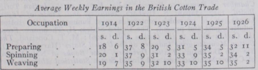 The figures include the effect of short time, overtime and piece work and are for the month of June each year except for 1926, where, to avoid the effect of the general strike, the figure for the month of April is used. The special enquiry of the Ministry of Labour in 1924, which covered 75% of the workers, showed that average weekly earnings for all workpeople was 36s. zod., for men 475. and for women 28s. 3d.
