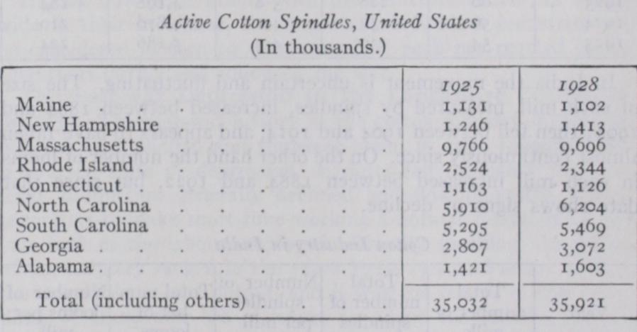 United States.—In the United States the industry is found almost equally divided between the New England and the cotton growing States of the South (April, 1928, New England 44%; cotton-growing States, 51% ; others 5%), though the tendency is for the development of the latter at the expense of the former. In the North, Massachusetts contains more than half the spindles, whilst in the South, North and South Carolina are the points of concentration. The numbers of spindles in the States possessing more than a million are shown below.