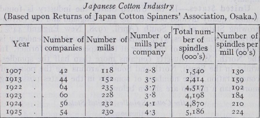 Japan.—In Japan the chief centre is Osaka, but the spindles and looms in other prefectures far outnumber those in this dis trict. The distribution of spindles and looms in Japan is changing rapidly.