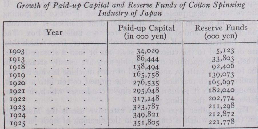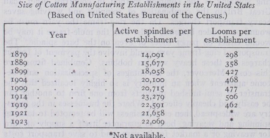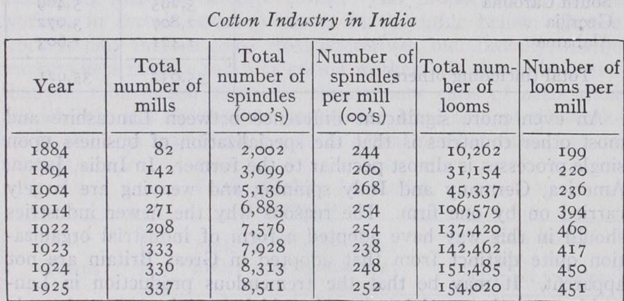 The cause of this setback in both India and the United States appears to be the same. In both countries the development of the industry is taking the form, not of growth around the old and well established centre, but of the appearance of mills in fresh areas. Naturally the new mills thus springing up are, on the whole, smaller than those which have had opportunity to grow to maturity elsewhere. Thus, in India, the mills of Ahmedabad are smaller than those in Bombay and the mills of the cotton-growing States of the United States smaller than those of the New Eng land States. But this condition is probably temporary. With time, youthful firms attain the size of maturity and gradually we may expect the disappearance of the purely transient factors which have operated in these two countries and the re-establishment of the inevitable movement towards large scale, both in spinning and weaving.
