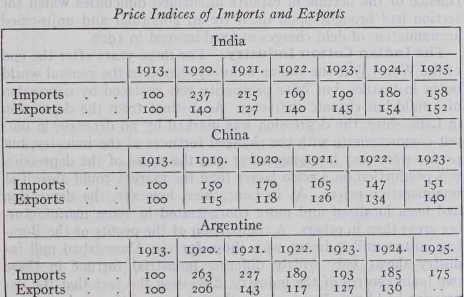 The political results of the war were not, however, so perma nent nor so deep-rooted as certain economic consequences. After the war there was a very marked tendency for the price of manu factured goods in the world to become dearer in relation to agri cultural products. The result was that a given unit of manufac tured goods commanded a larger unit of agricultural commodi ties than it could have commanded in 1913. This produced in the Eastern races—largely engaged in agriculture and consuming vast quantities of machine-made cotton cloth—a considerable decline in purchasing power and a falling off in the quality of the cotton cloth bought. The divergence between world agricultural and industrial prices became less by 1928, but it remained, between 1920 and 1925, a factor of universal application, redirecting world trade along channels foreign to those of 1913. This fact is clearly revealed by a study of the values of imports and exports of India, China and the Argentine between 1913 and 1925. In the case of all three countries the imports are largely manufactured goods and the exports agricultural products, and in each case it will be seen that, since 1913, the rise in the value of imports has been much greater than that of exports.
