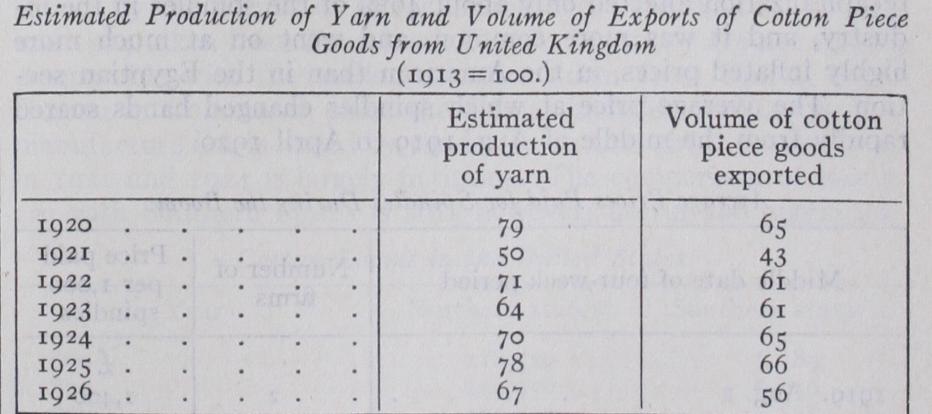 One or two transient factors operated on occasions after 1920 to impede the recovery of an industry whose difficulties were caused by other and more fundamental conditions. The policy of deflation, adopted between 1921 and 1924, naturally harassed exports whilst it was in process, and the sudden resumption of the gold standard appears to have caused a sharp, if temporary, re duction in exports and employment. The high price of American cotton in the seasons 1921-24, due to abnormally low crops, pre vented the fall in the cost of production that had necessarily to precede any enlargement of demand. Both these factors had dis appeared by 1927 and yet the fundamental maladjustment of the industry to the changed conditions of the post-war economic sys tem prevented even a distant approach to conditions of prosperity.
