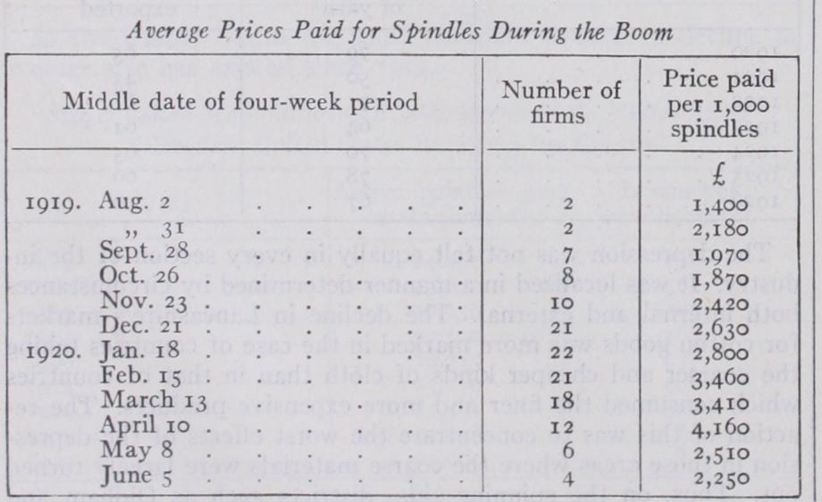 Apart from questions of technical efficiency, the greatest hin drance to the forcing down of cost of production which might have enabled the industry in Great Britain to restore or main tain its position, was the existence, in the spinning industry, of a heavy debt burden of debentures, loans and bank overdrafts upon which interest had to be paid which, in turn, was placed upon the selling price. That burden was largely created during the boom in cotton in 1919 and 1920, when spinning mills fre quently and rapidly changed hands at highly inflated prices. This recapitalization affected only about 46% of the spindles in the in dustry, and it was more common, and went on at much more highly inflated prices, in the American than in the Egyptian sec tion. The average price at which spindles changed hands soared rapidly from the middle of Aug. 1919 to April 1920.