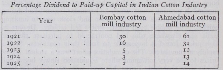 Af ter the end of the war the Indian industry, and particularly the Bombay section, felt seriously the effect of the development of the cotton mill industry in China. Bef ore the war the exports of yarn from India to China ranged between i 5o and 200 million lb. But the growth of spindles in China from about 5oo,000 in 1913 to over 3,000,00o in 1925, combined with the increased com petition of Japan in that market, caused a remarkable, and prob ably permanent, decrease in these exports. Much of that yarn was exported from the Bombay industry and with its decline dis appeared one of the methods by which the overhead costs of that industry were formerly spread thinly over a large production. The decline is shown in the table.