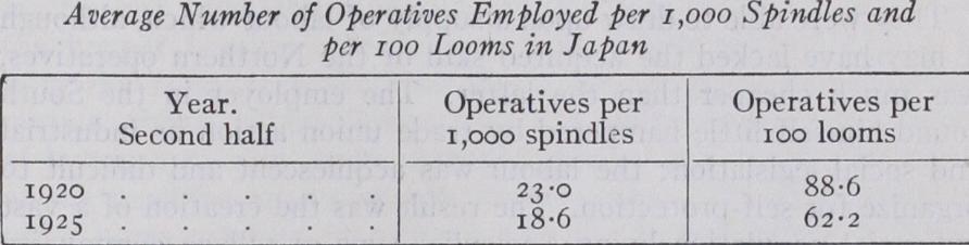 The tendency which has been noticed for the cotton industry in India to expand in new areas finds its counterpart in Japan, where the former concentration of spindles in Osaka began to break down after the war with the growth in outside districts. At the end of 1925, 24% of the total spindleage was to be found in the prefecture of Osaka, but the price of land there had become so high with the concentration of industry and population that this percentage tended to decrease as the cotton mills in Aichi, and particularly Nagoya, developed. The war-boom prosperity was not allowed to wane from any lack of technical efficiency. Elec tricity has largely replaced steam as the motive power and the bulk of the mills now use electricity with a consequent reduction in the cost of production. Either as the outcome of the increased efficiency of the operatives or the use of machinery more easily controlled, or both, the number of operatives employed per active spindle or loom decreased in the manner shown by figures taken from W. B. Cunningham's report on the Cotton Spinning and Weaving Industry of Japan.