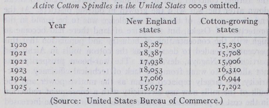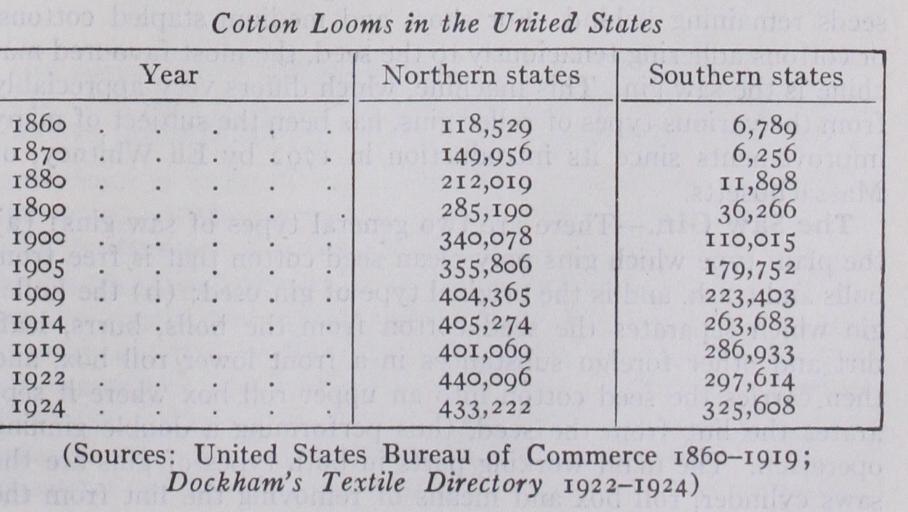 The industry has for long been concentrated in two areas. The New England States were the original home of cotton manufac ture, but towards the end of the 19th century spindles and looms began to be established in the Southern States and particularly in the cotton-growing States. Up to 1913 both sections showed rapid growth based upon the steadily increasing demands of the home market. After the conclusion of the World War that position changed. The New England textile industry felt a depression as long continued and almost as keen as that in England. The in dustry of the Southern States gathered strength and impetus until it rivalled its competitor in output and in capital equipment. The speed with which the new overhauled the old industry is shown by the figures of looms established. The figures for 1922 and 1924 taken from Dockham's Textile Directory are not strictly comparable with the earlier statistics taken from United States Bureau of Commerce, since the former includes certain types of manufacture not included by the latter, so that the increase shown in 1922 and 1924 is largely fictitious. The comparison of North ern with Southern States is still, however, useful and significant.